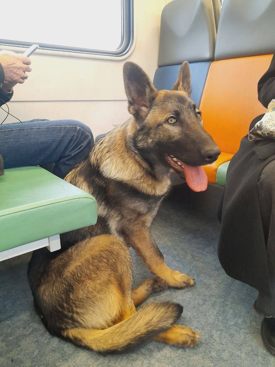 В электричку Можайск-Лобня утром в начале одиннадцатого 20.10.2025 на Кубинке в вагон зашла немецкая овчарка. Молодой кобель. На шерсти виден след от ошейника. Есть не хочет, ходит за мужчинами.