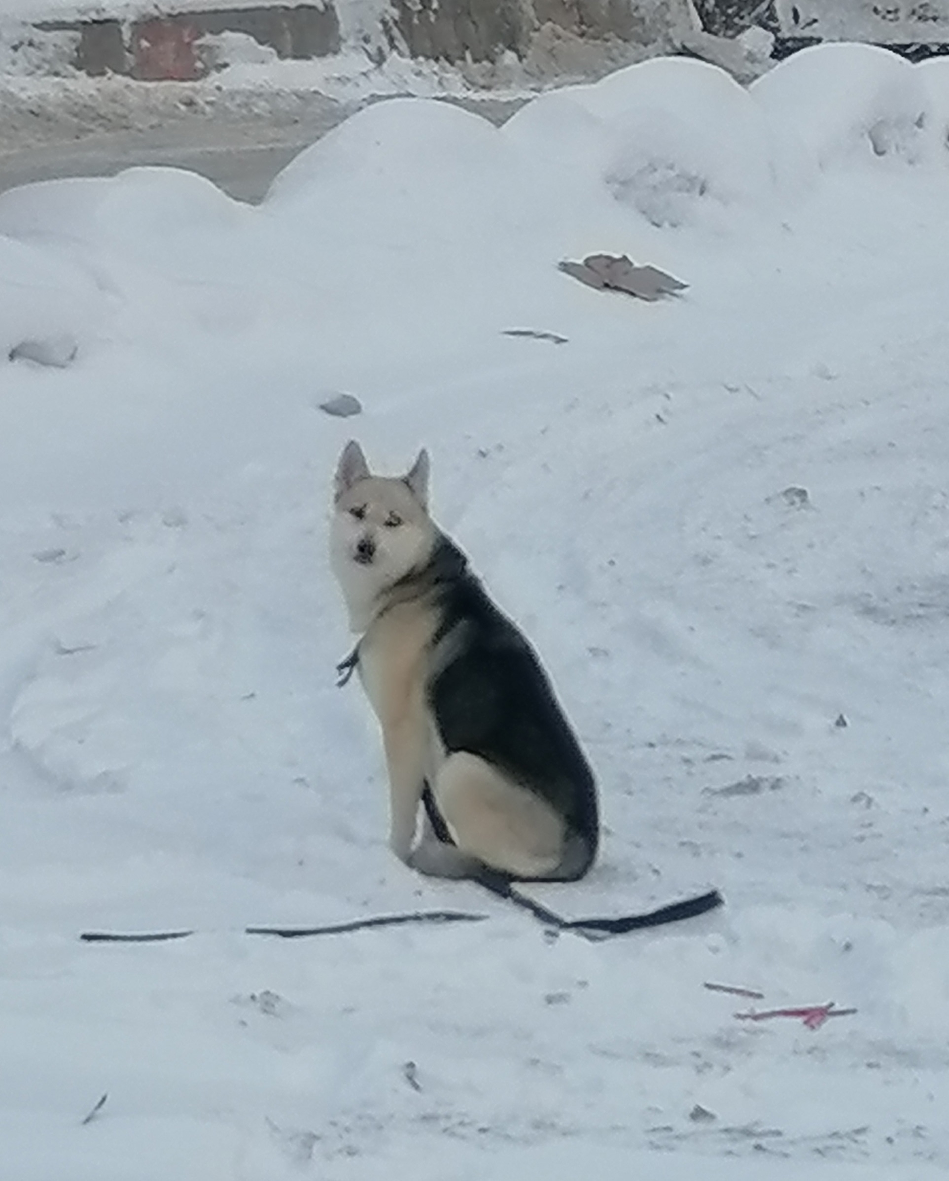 02.02.2026 Мурманск, ул. Мира, в районе конечной остановки автобусов 29, 11 несколько часов сидит пес, похожий на лайку, с поводком или обрывом верёвки. Возможно, потерялся или убежал. Ждёт, не уходит.