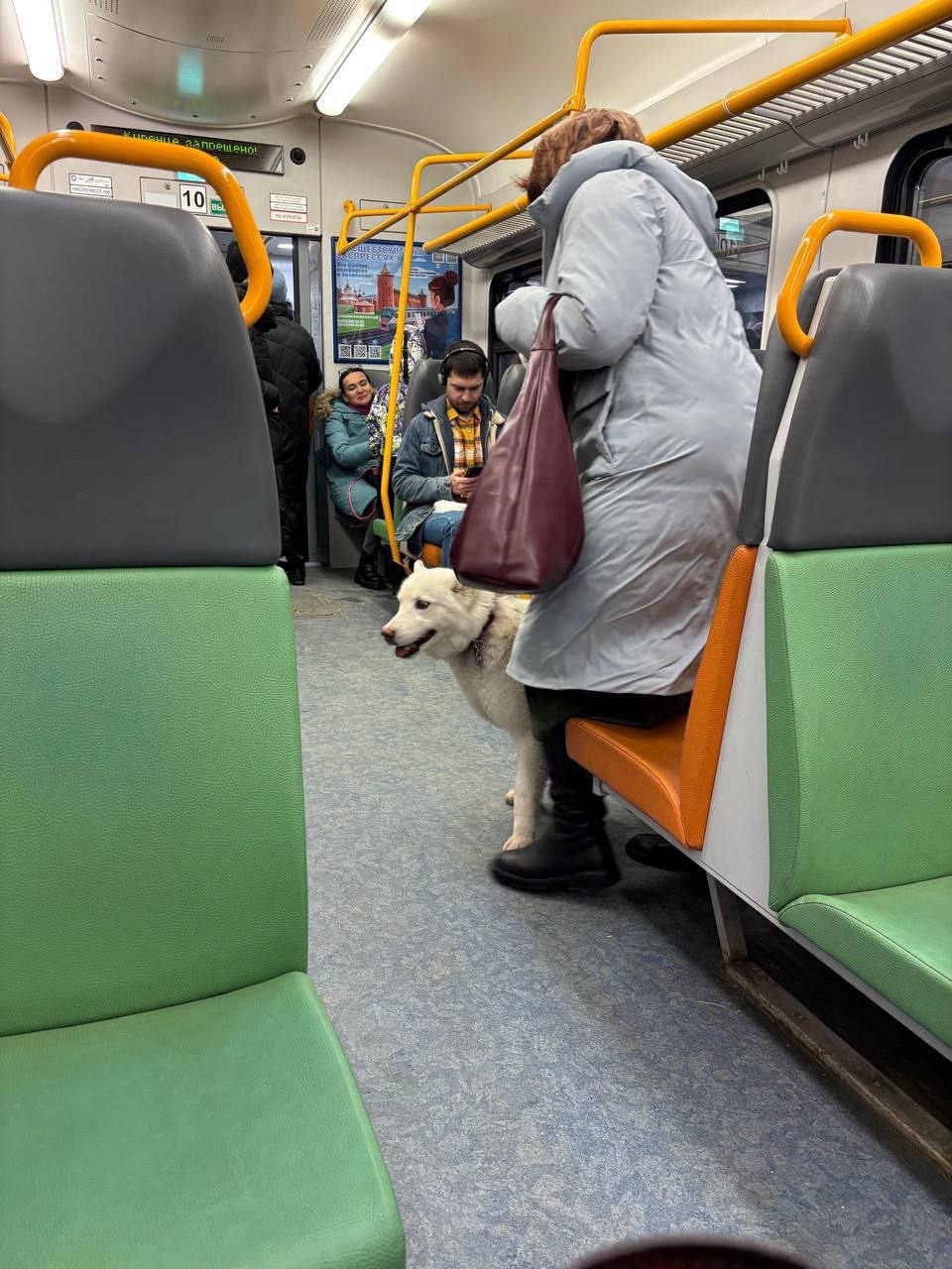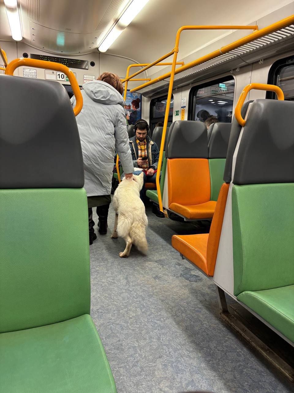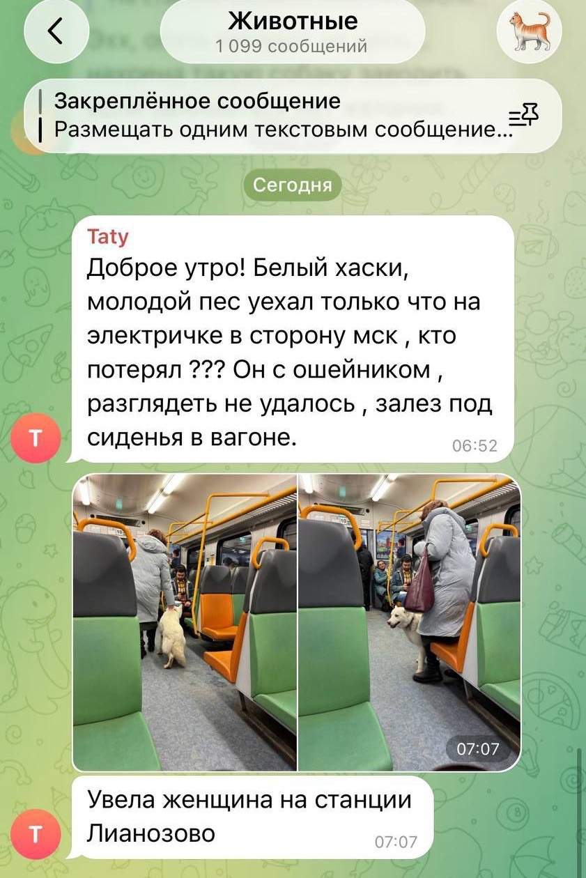 Доброе утро! Белый хаски, молодой пес уехал только что на электричке в сторону мск , кто потерял ??? Он с ошейником , разглядеть не удалось , залез под сиденья в вагоне.