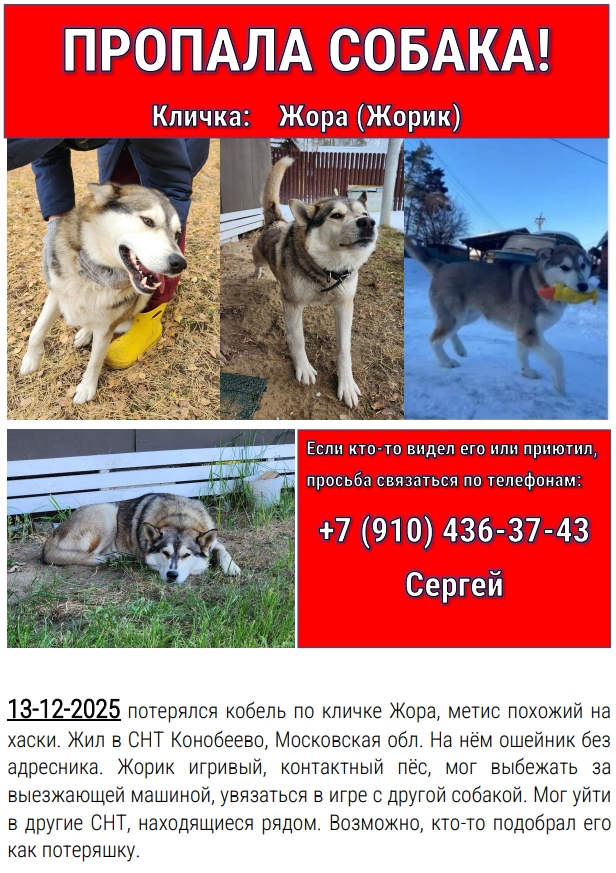 13-12-2025 потерялся кобель по кличке Жора, метис похожий на хаски. Жил в СНТ Конобеево, Московская обл. На нём ошейник без адресника. Жорик игривый, контактный пёс, мог выбежать за выезжающей машиной, увязаться в игре с другой собакой. Мог уйти в другие СНТ, находящиеся рядом. Возможно, кто-то подобрал его как потеряшку.
