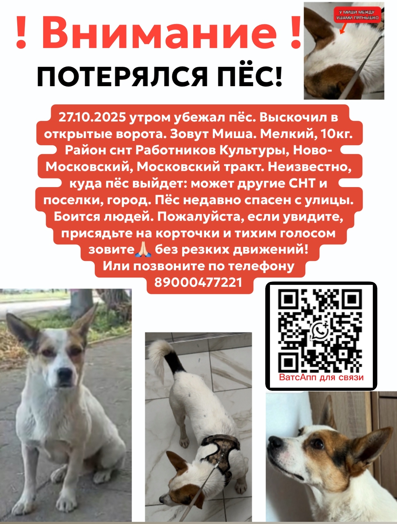 27.10.2025 утром убежал пёс. Выскочил в открытые ворота. Зовут Миша. Мелкий, 10кг. На нем адресник, но может потерять. Район снт Работников Культуры, Ново-Московский, Московский тракт. На сегодня, 31.10.2025 уже может быть в любом районе, поселении, СНТ и в Екатеринбурге. Неизвестно, куда пёс выйдет, но выйдет точно к людям. Пёс недавно спасен с улицы. После кастрации. Боится людей, осторожен. Пожалуйста, если увидите, присядьте на корточки без резких движений тихим голосом зовите🙏🏻 Если получится, зафиксируйте и позвоните по телефону 89000477221 Я сразу приеду🙏🏻
