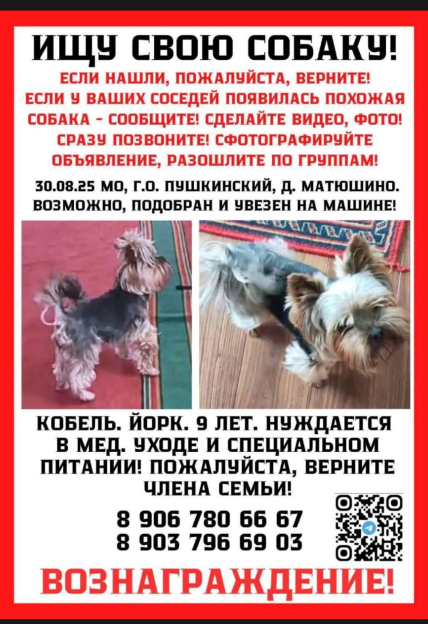 30.08.25 МО Пушкинский район д Матюшино пропал Йорк, мальчик, 9 лет, без зубов, нуждается в спец уходе. Был увезен на машине, может быть где угодно. У ваших соседей похожая собака, звоните в любое время, это очень важно. Анонимность гарантируется. Вознаграждение 50 тыс.руб.