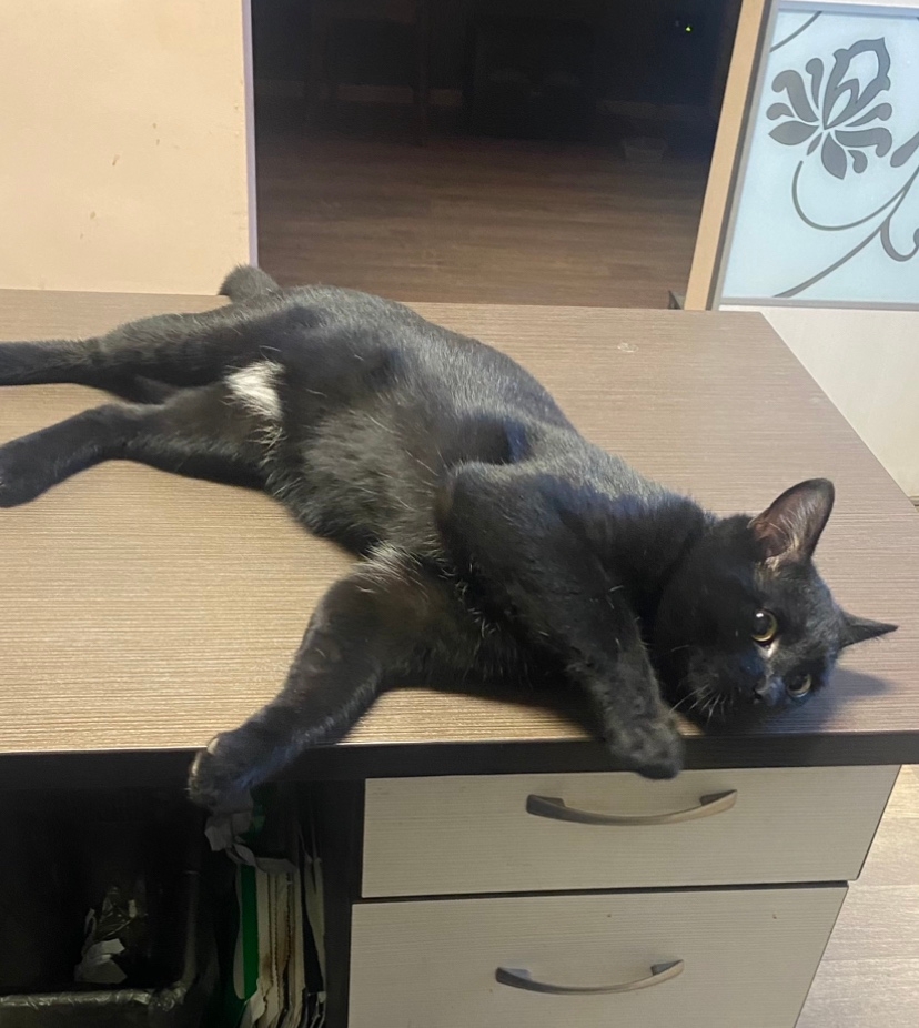 Черный. Грудка и живот белые. Кастрирован.