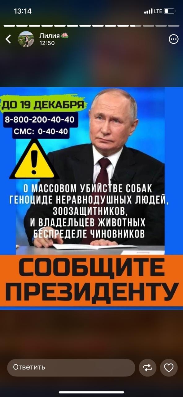 Владимир Владимирович, мы очень просим Вас дать заново поручения регионам, применяющим позорную практику античеловечного и часто садисткого умерщвления животных с целью сокращения их численности, чтобы они развернулись к передовым мерам.