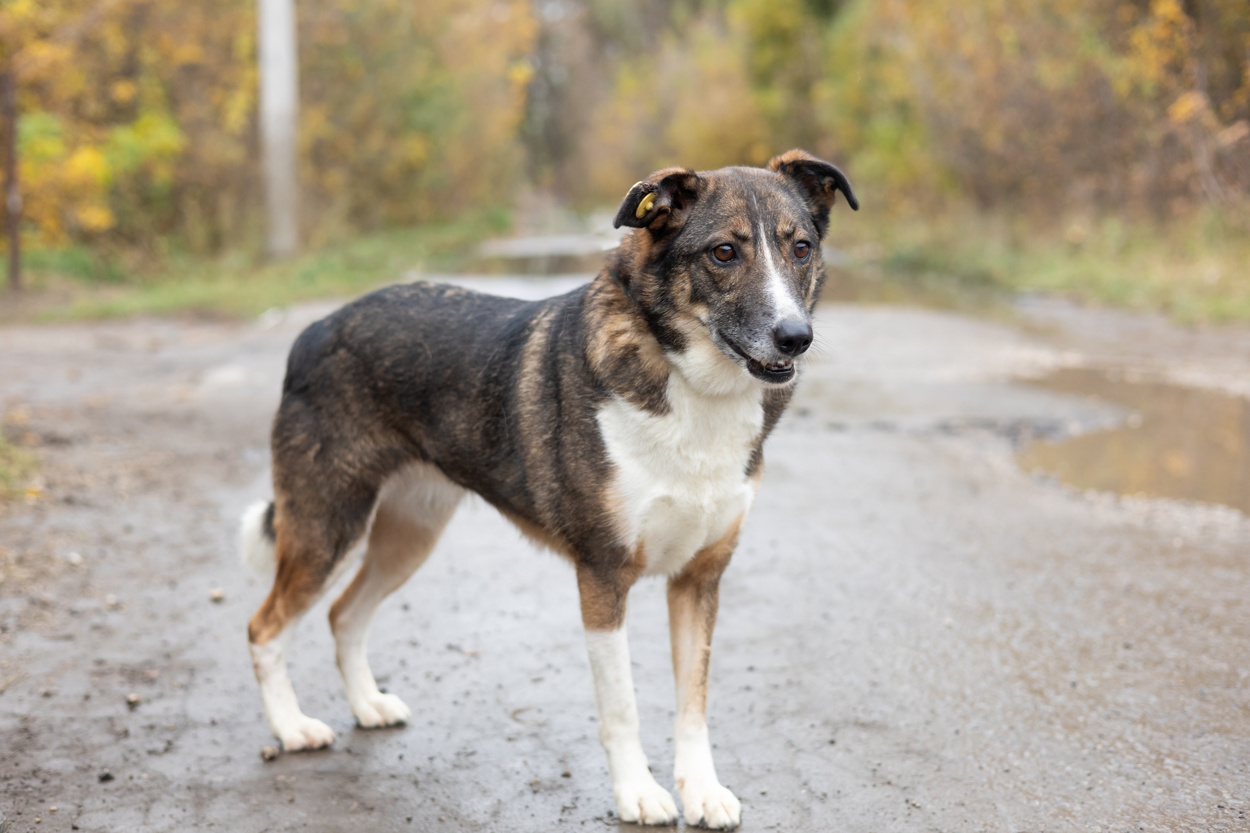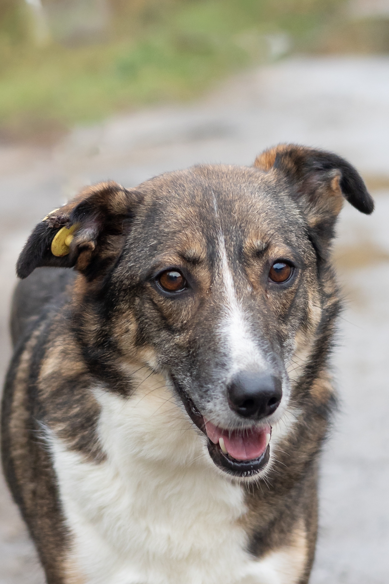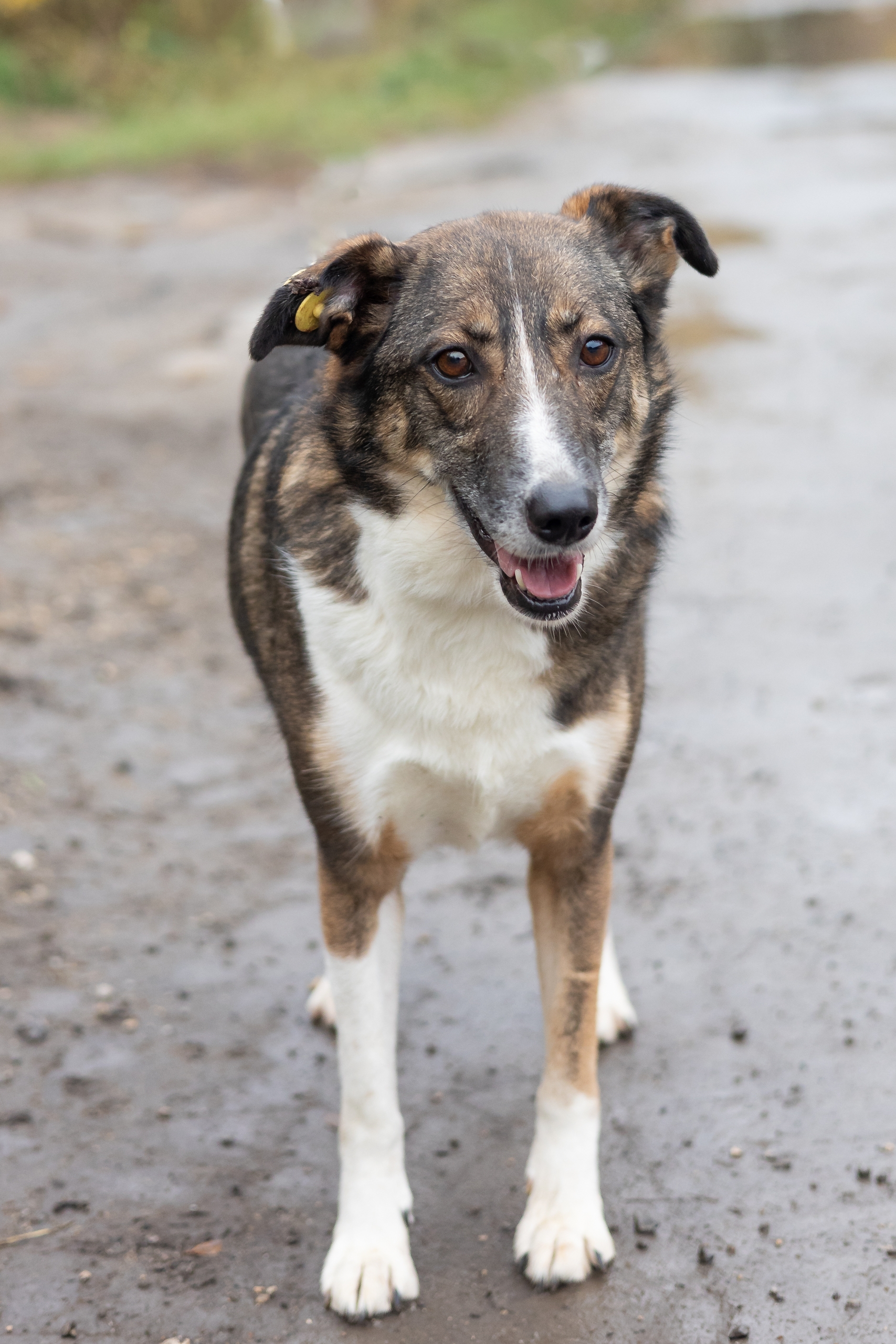 Афине около 4 лет, она среднего размера, очень доброжелательна к людям, не конфликтует с другими собаками, умна и очень скромна