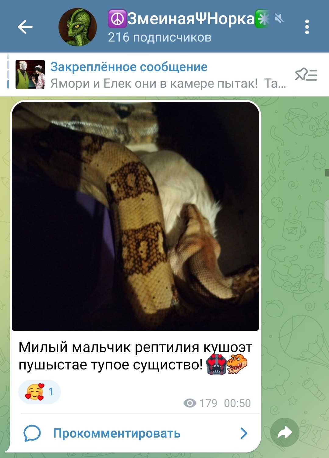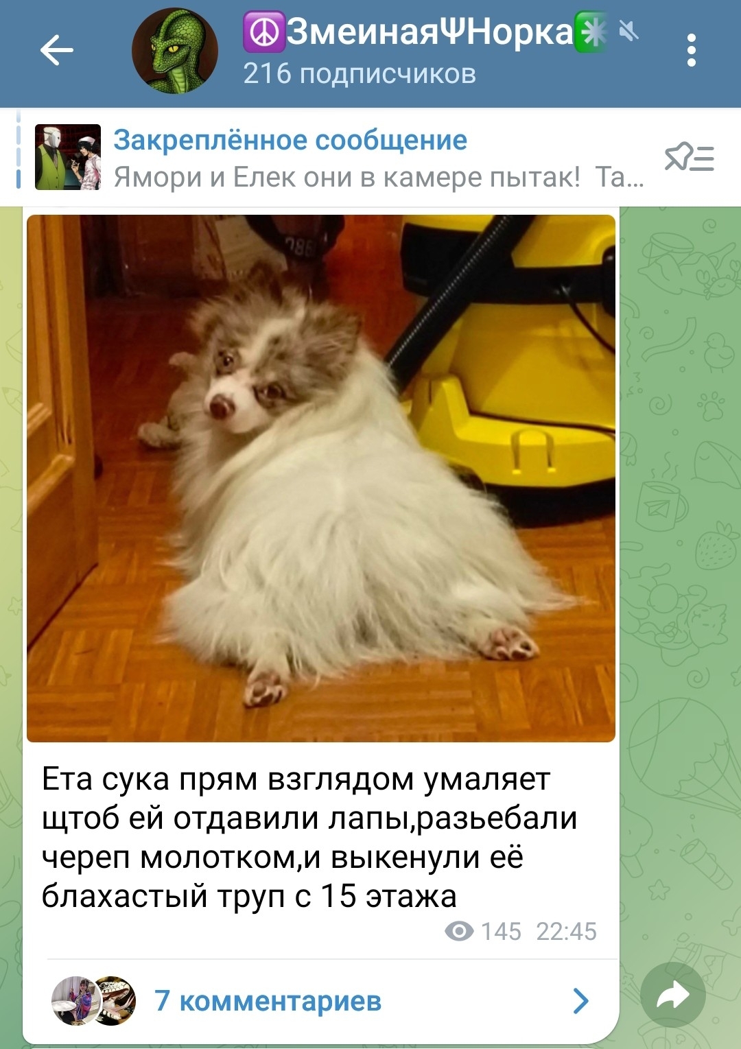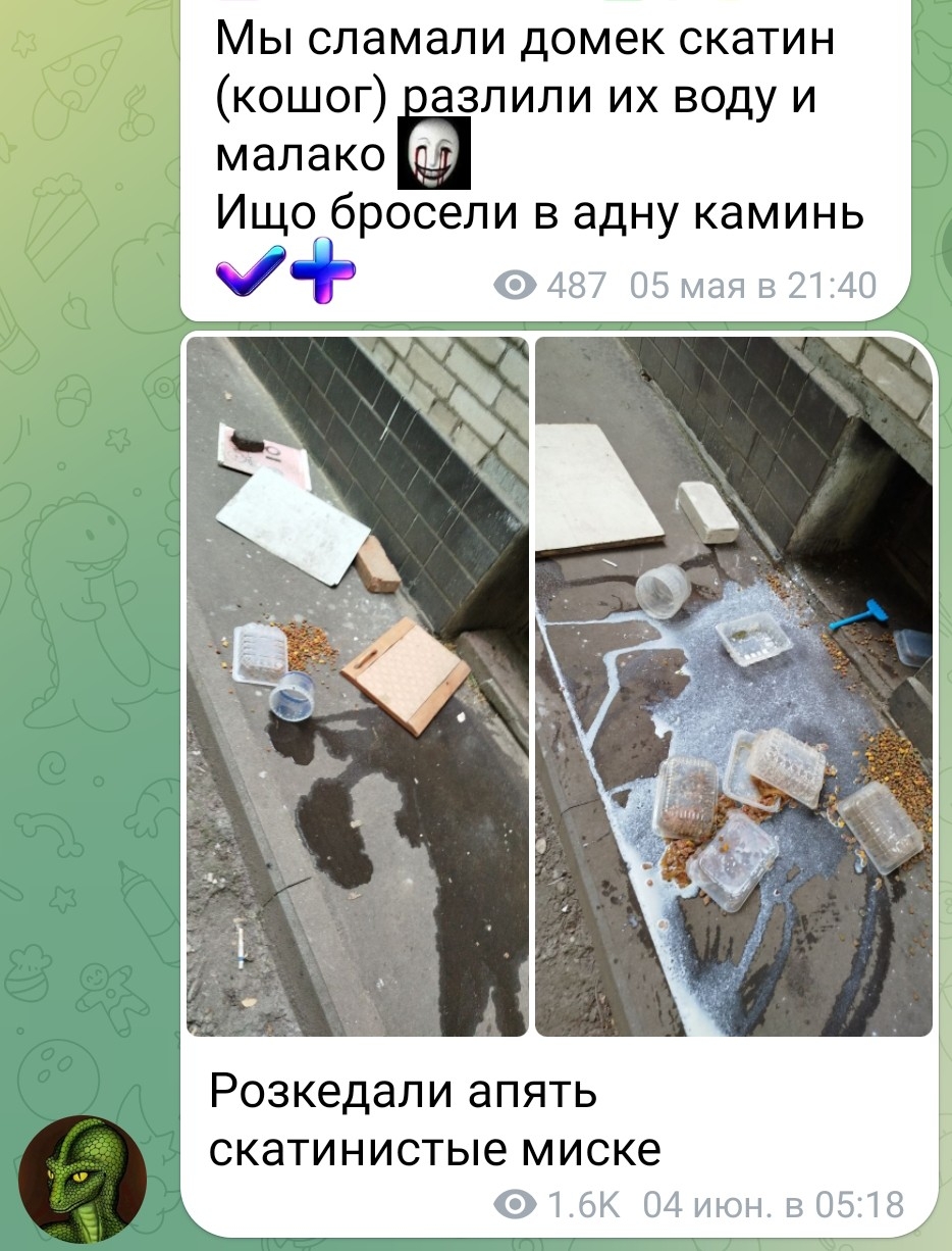 Реутовская живодёрка дарья смирнова, которая называет убийство животных “высоким искусством” и ранее была судима за живодёрство, и её сожитель валя называют себя главными живодёрами России и говорят, что они будут сжигать зоозащитников, как и животных(ст. 282, экстремизм), кидают кирпичами в кошек, опрокидывают, выливают и отравляют корм животных, ломают домики для животных и скармливают животных змеям, которых смирнова держит у себя в квартире.