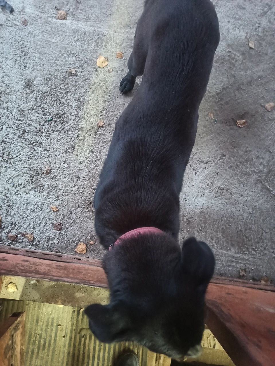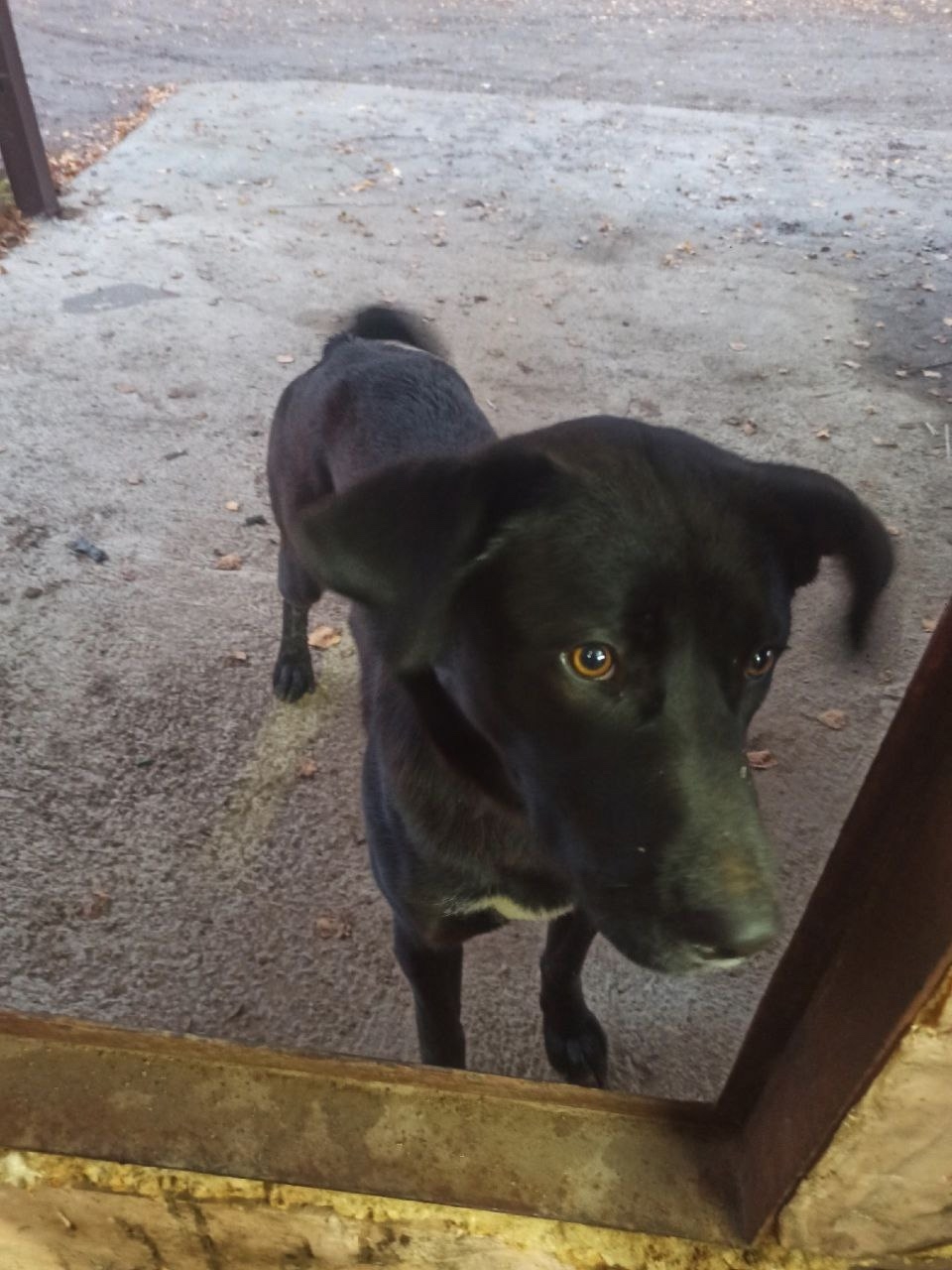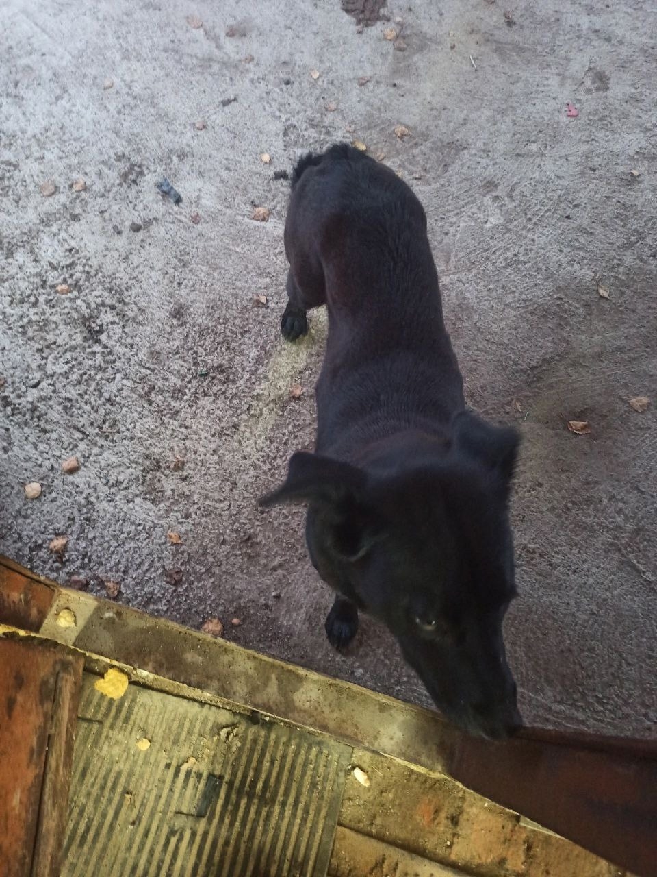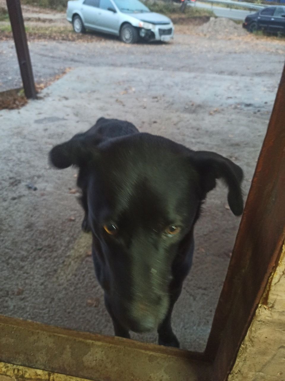 На въезде в Новосиньково, возле гаражей, где шиномонтаж, прибилась собака с ошейником.