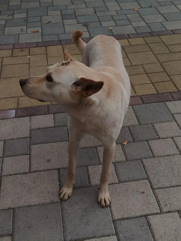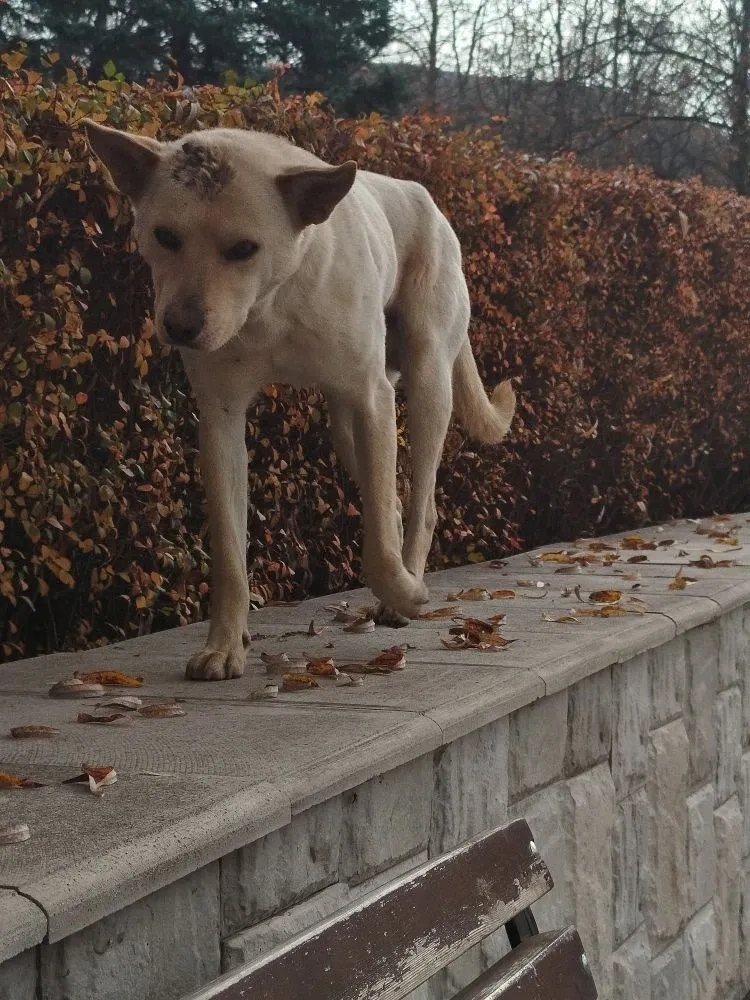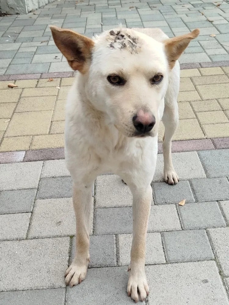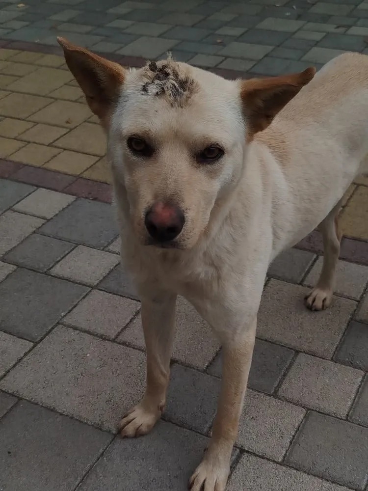 Почему пишу, на голове запекшаяся кровь, видимо кто-то ударил пса по голове. Спросила у охраны санатория, пёс прибился. Сколько тут он и как долго ему дадут быть тут трудно сказать, но то, что его от сюда скоро попросят убрать – дело времени, а там какие к нему меры предпримут, только догадываться.