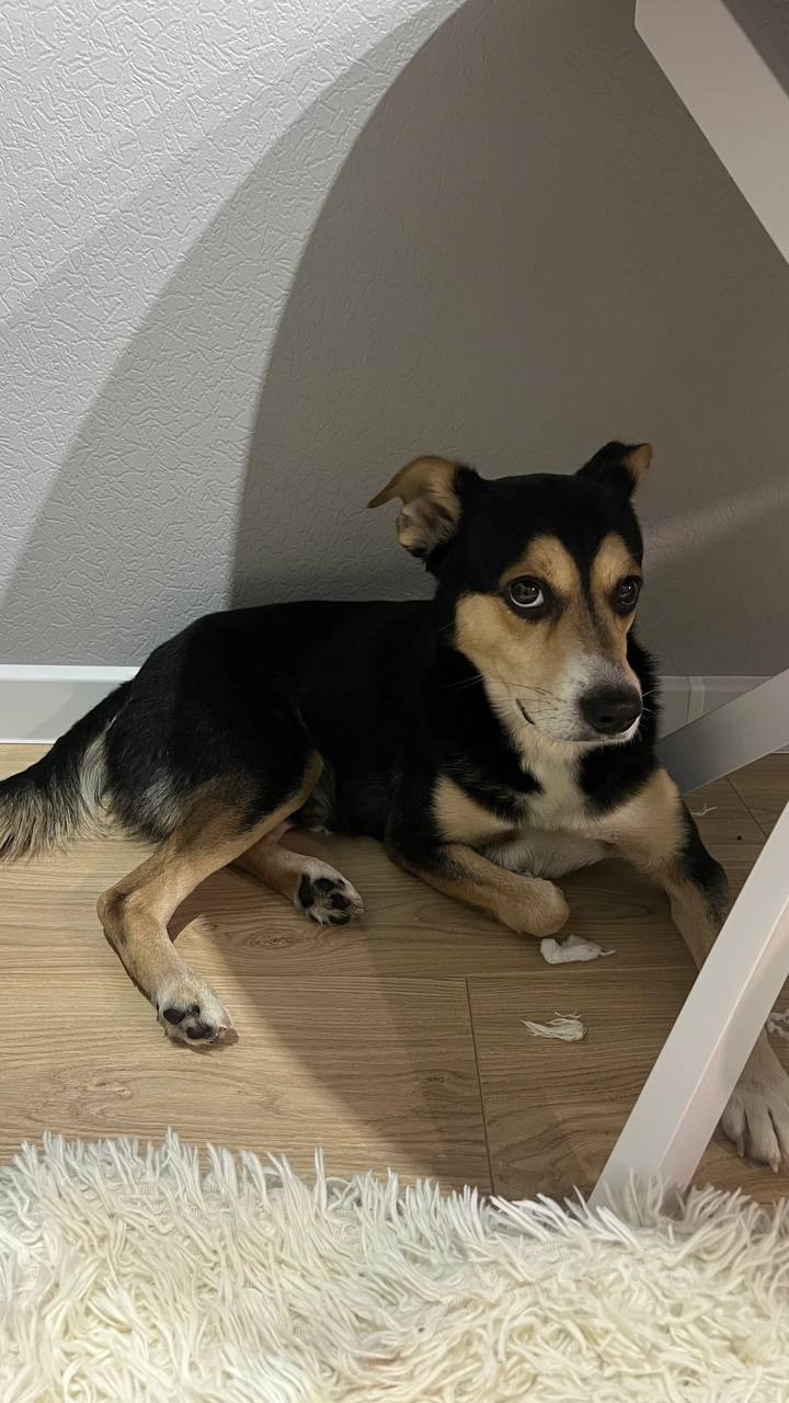 Нашли песика , он примерно до колен , скорее всего выбросили , в ошейнике , он очень послушный, знает команды , добрый, трусишка немного , мы его кастрируем и вакцинируем , но придержали пока до 5 февраля только.
