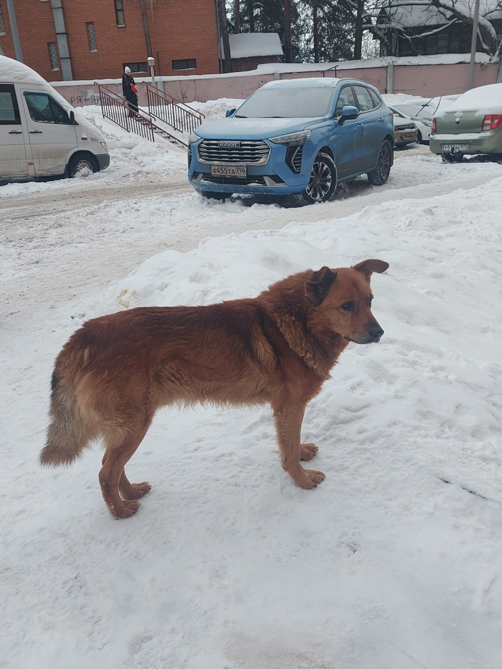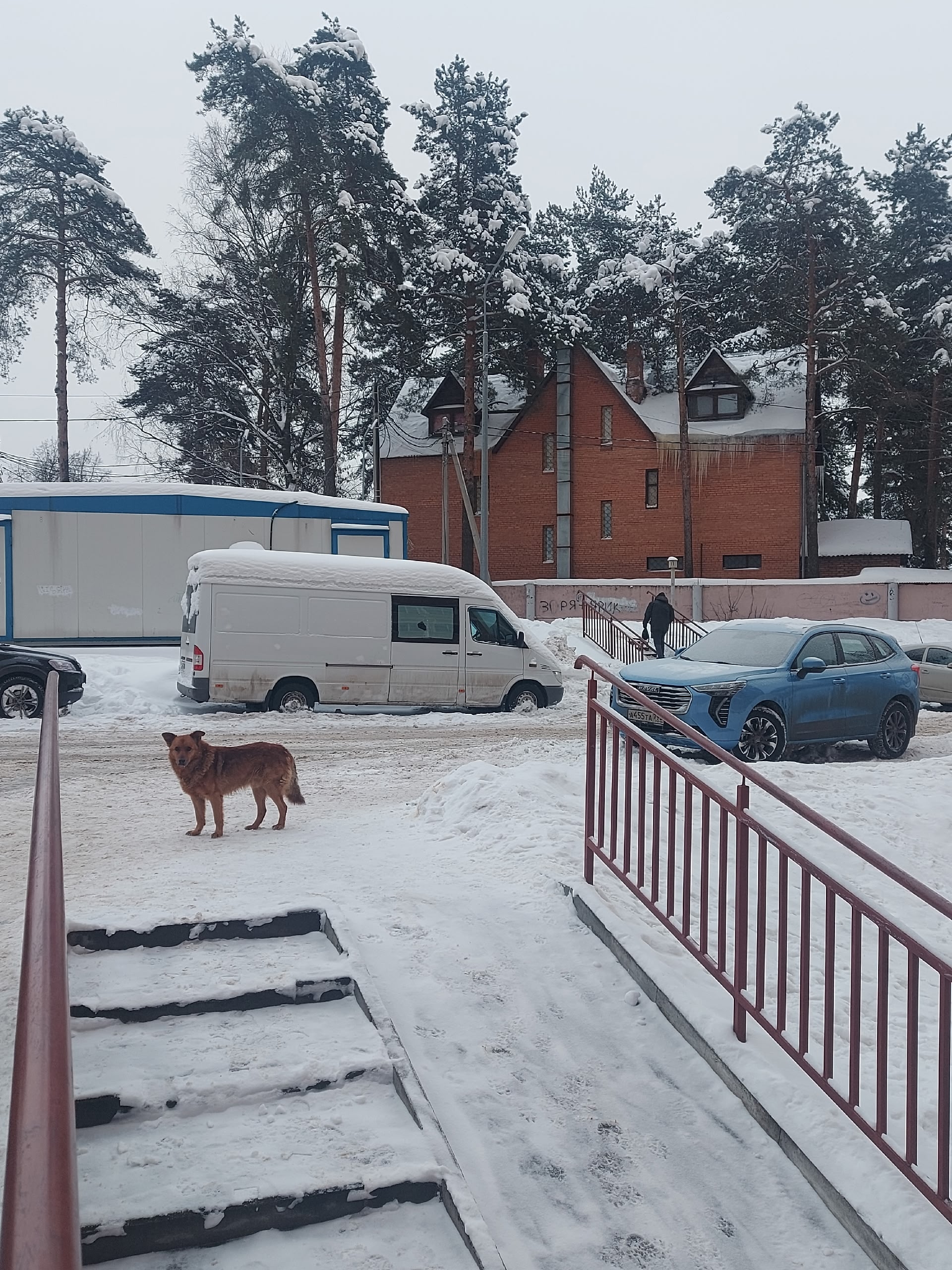 Добрый день! Пес не отходит от 1 го подъезда, Лучистая, 6. Раньше..