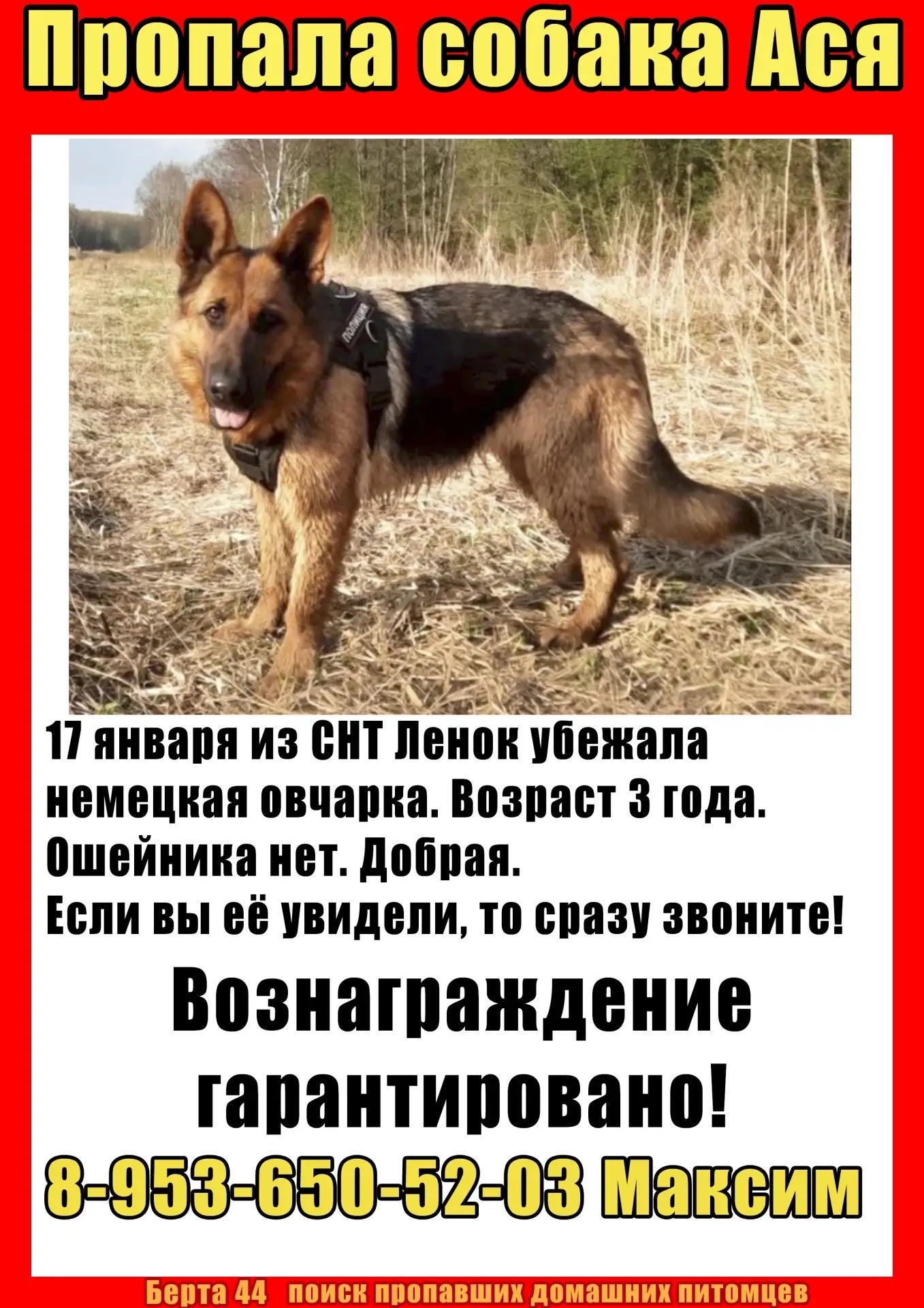 17 января немецкая овчарка убежала из СНТ «Ленок» в городе Кострома.