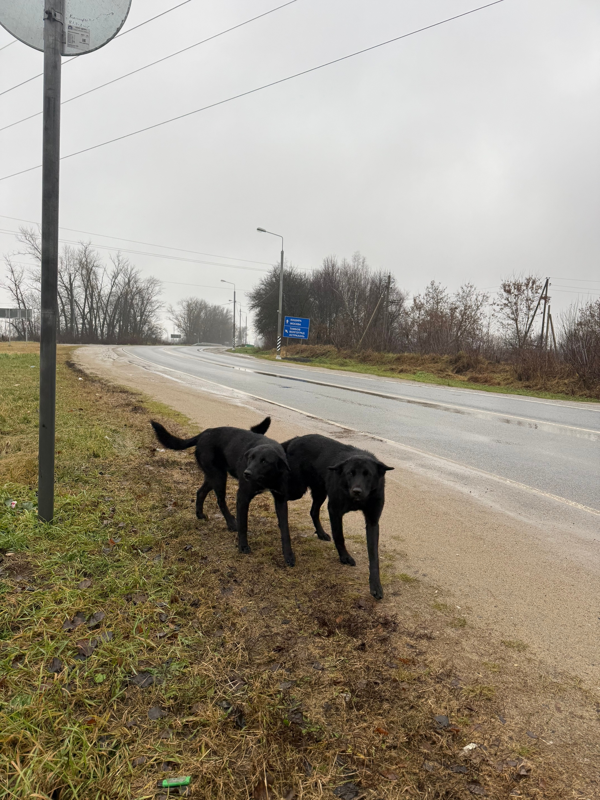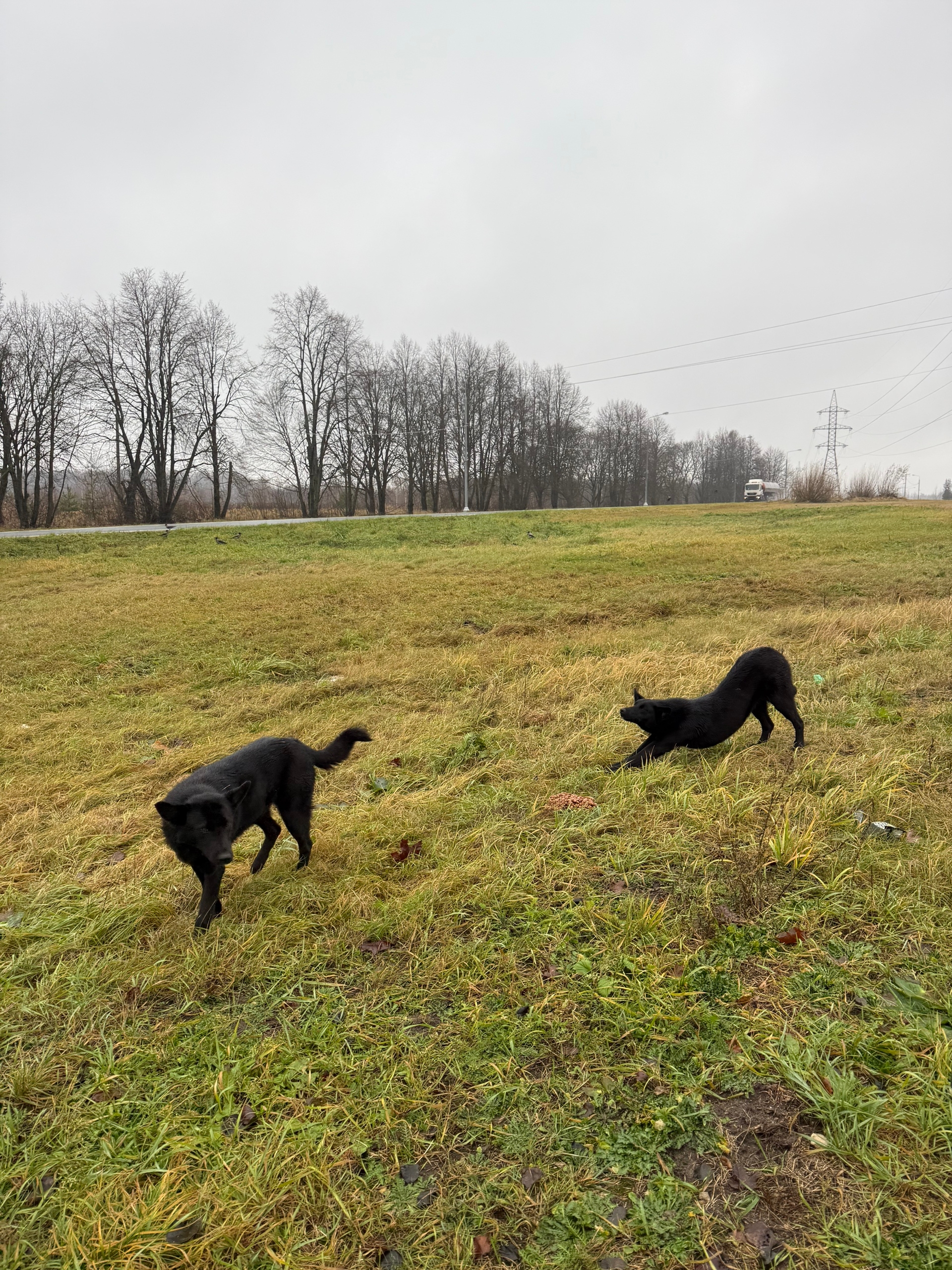 Вчера заметила этих двоих около дороги, остановилась покормить, сегодня они снова тут. Людей они побаиваются, но пытаются выйти на контакт, подходят, нюхают. Ощущение, что в этом месте кто-то выбросил, они как-будто ждут кого-то. Сутки сидят на пяточке вдоль дорог.