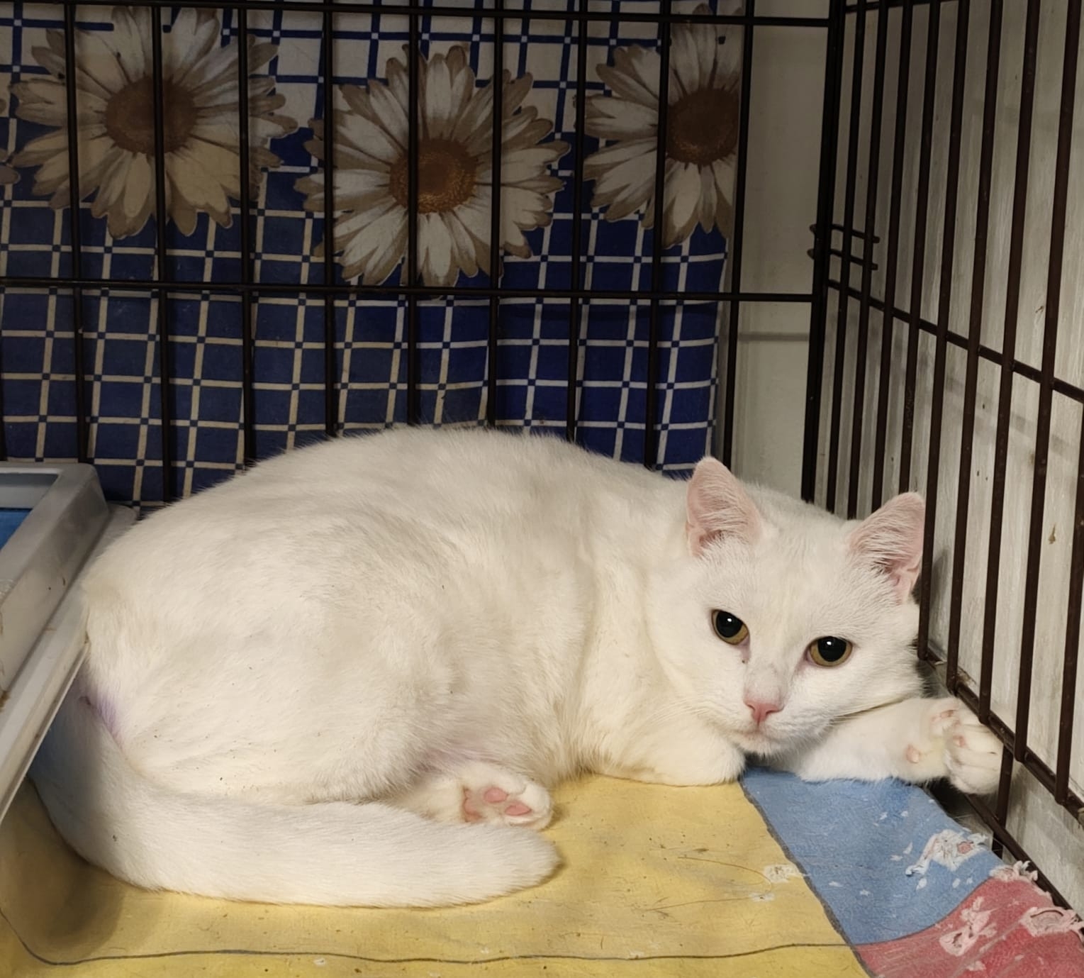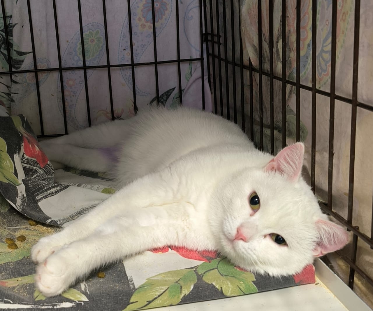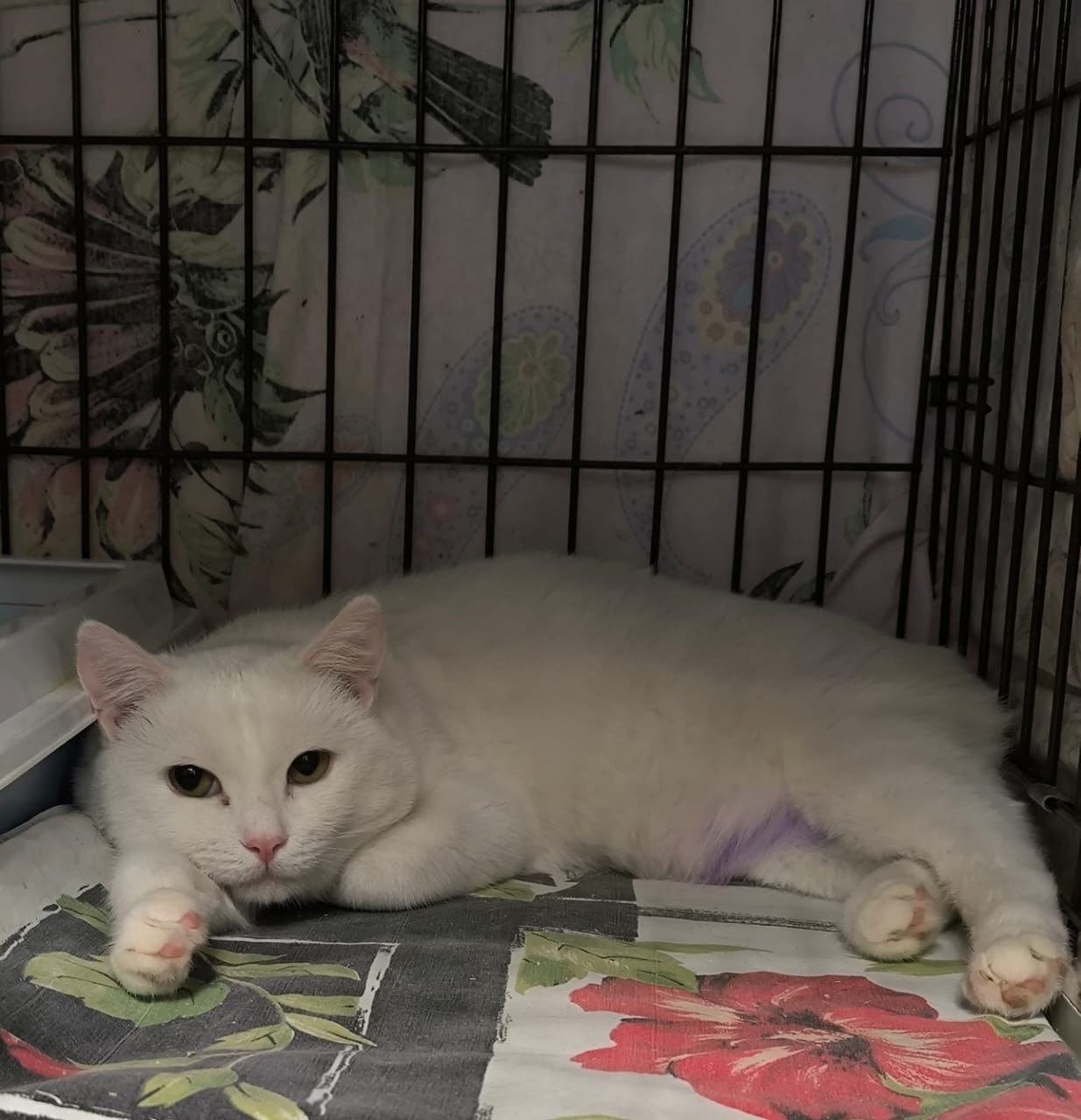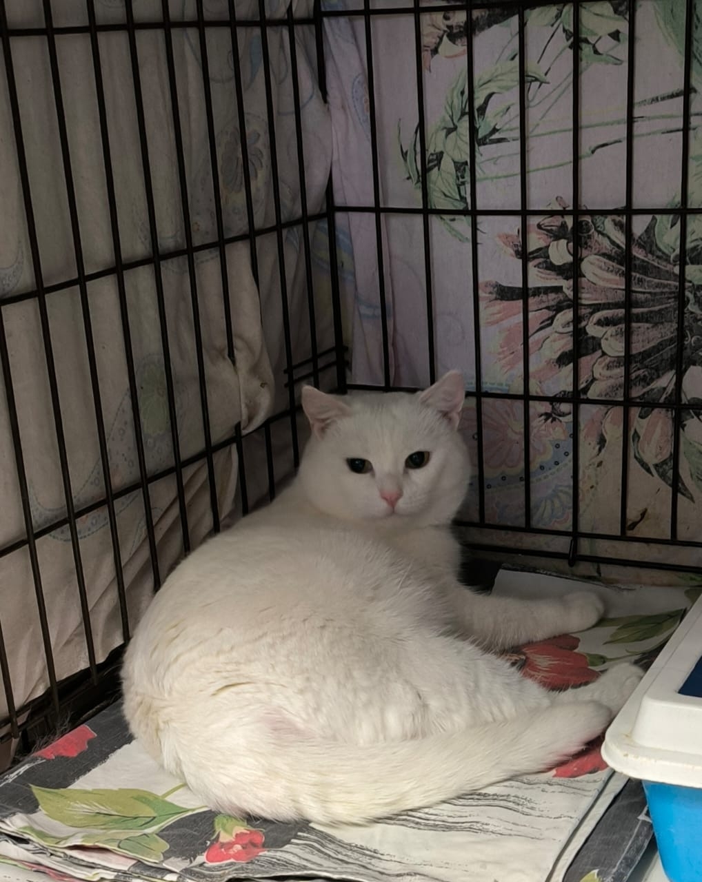 Его явно выкинули! Выкинули на глухом полустанке, где нет никакого жилья. Только заброшенное, сгоревшее кафе и рядом федеральная трасса, по которой сплошным потоком мчатся машины. Как он там выжил – совершенно непонятно! Женщина, проезжавшая мимо, увидела его, беленького, заметного, хотела хотя бы накормить, но с собой у неё был только пирожок с морковной начинкой. Его она и покрошила котику. И он с такой жадностью накинулся на этот пирожок, как-будто это был самый вкусный кусок мяса!