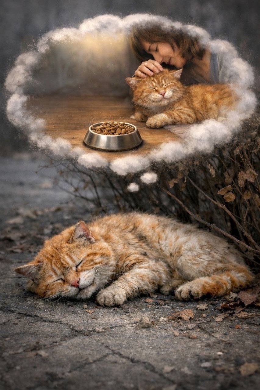Однажды он уже не смог встать. Сил не осталось. Он лёг у стены, там, где солнце немного согревало бетон. Дышать было трудно. Мир стал тихим, как будто его укрыли мягким одеялом.