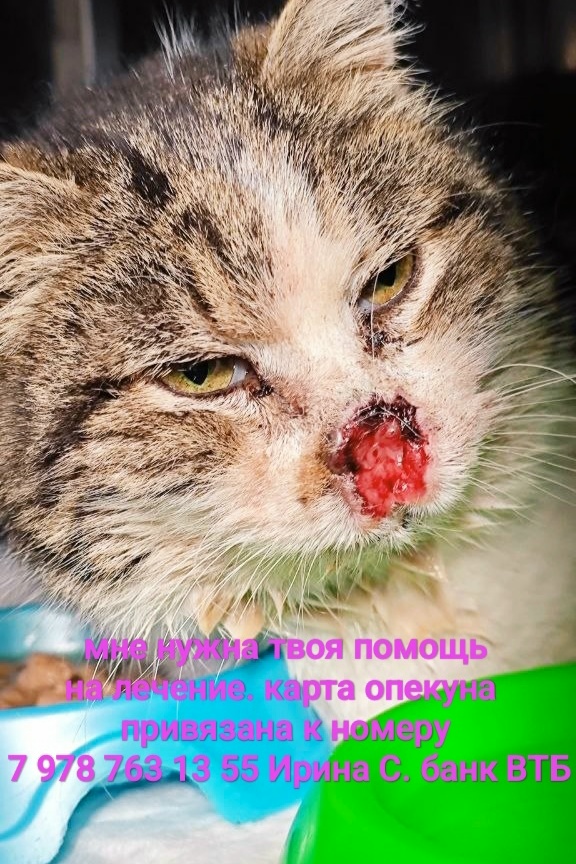 Дорогой друг, это Мурка — уличная кошка. Сейчас она в тяжёлом состоянии: глубокая рана на носу, истощение, неизвестный диагноз. В понедельник — приём у онколога. Нужно понять, есть ли онкология и успеем ли помочь.