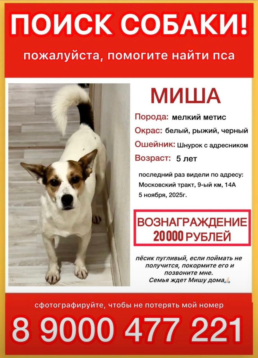 Приметы: полностью белый, рыжие уши, черное пятно от основания до половины хвоста. На шее был шнурок. Миша истощен и напуган. В руки он не дастся, не ловите его, пожалуйста!
