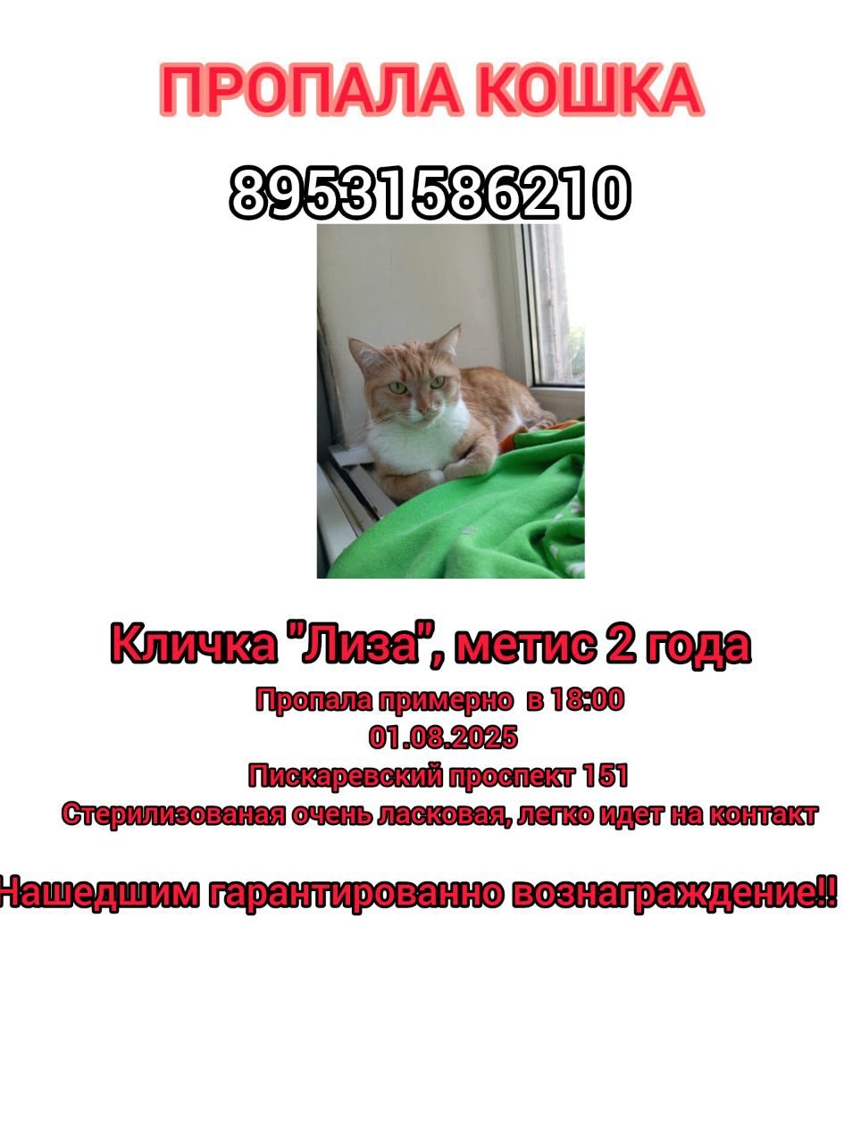 Если вы увидели похожую кошку: пожалуйста сделайте фото и отправьте его ЛС или любым удобным способом, пока не получите ответа, пожалуйста, держите её на виду, если киса окажется та самая дождитесь и получите вознаграждение! Её очень ждут дома и любят!