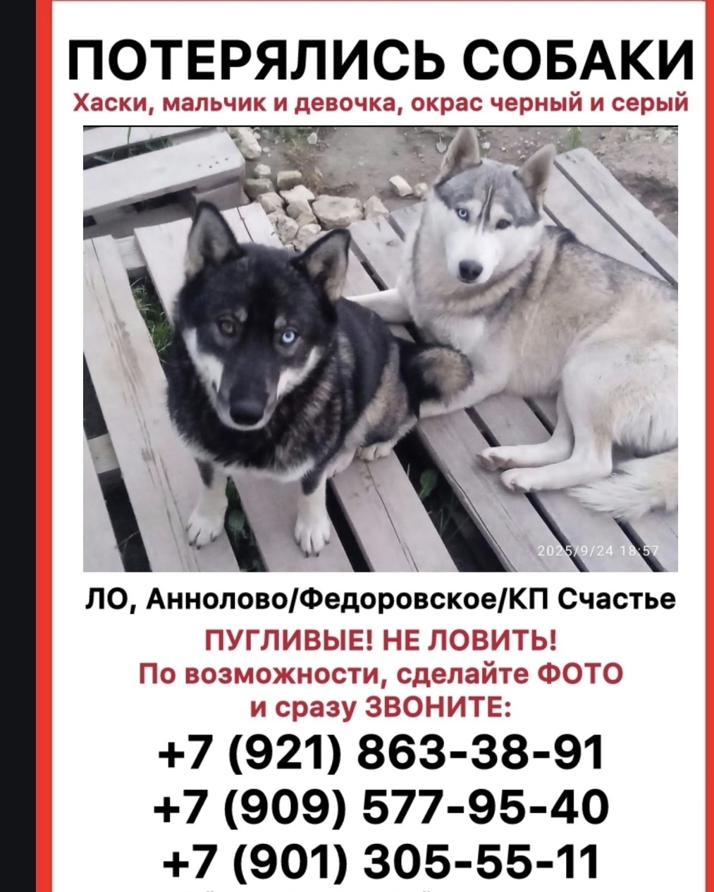 Федоровское/Аннолово/ЖК Счастье! Срочный поиск собак!! Ищем двух хасей брата и сестру ,чтоб забрать собак на передержку и найти им новые дома! Очень нужна помощь всех неравнодушных людей в поиске этих собак, тк они перемещаются по населенным пунктам, не можем застать в одном месте! Если видите собак звоните :