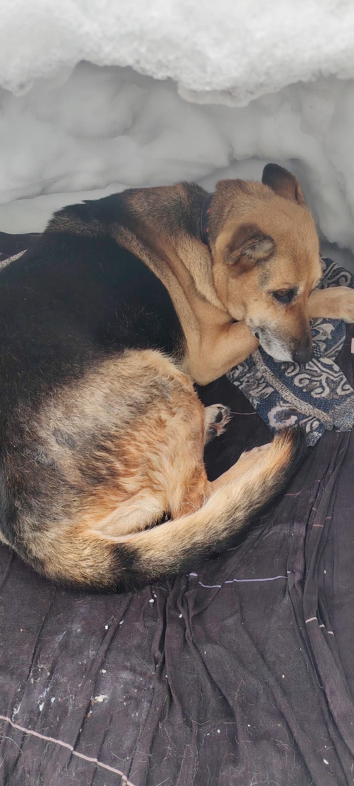 Снег тает, собака лежит на сырой подстилке, дрожит.