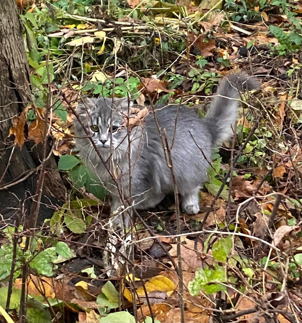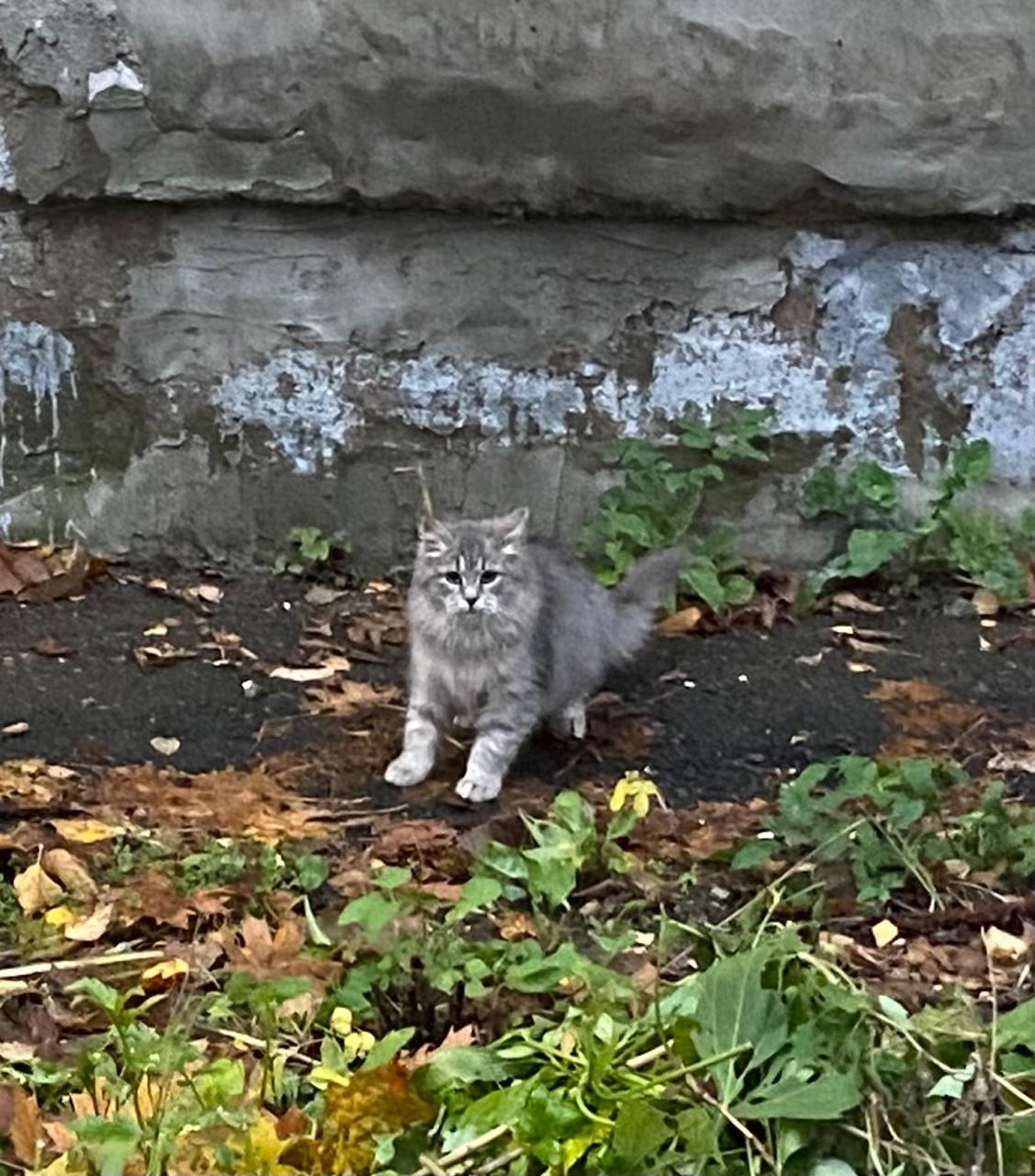На Московском проспекте к месту кормления кошек подбросили этого котёнка (девочку), видимо бывшедомашнюю, потому что котёнок в подвал не идёт, не понимает, что это такое.