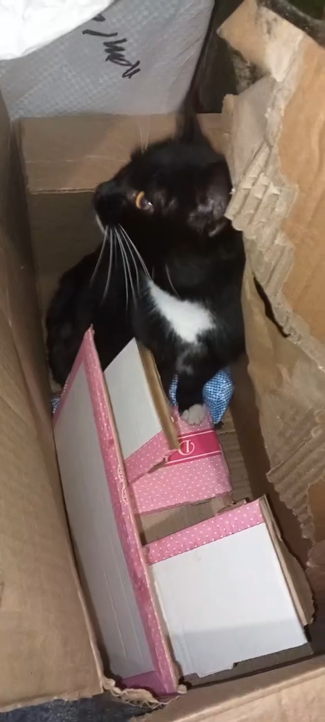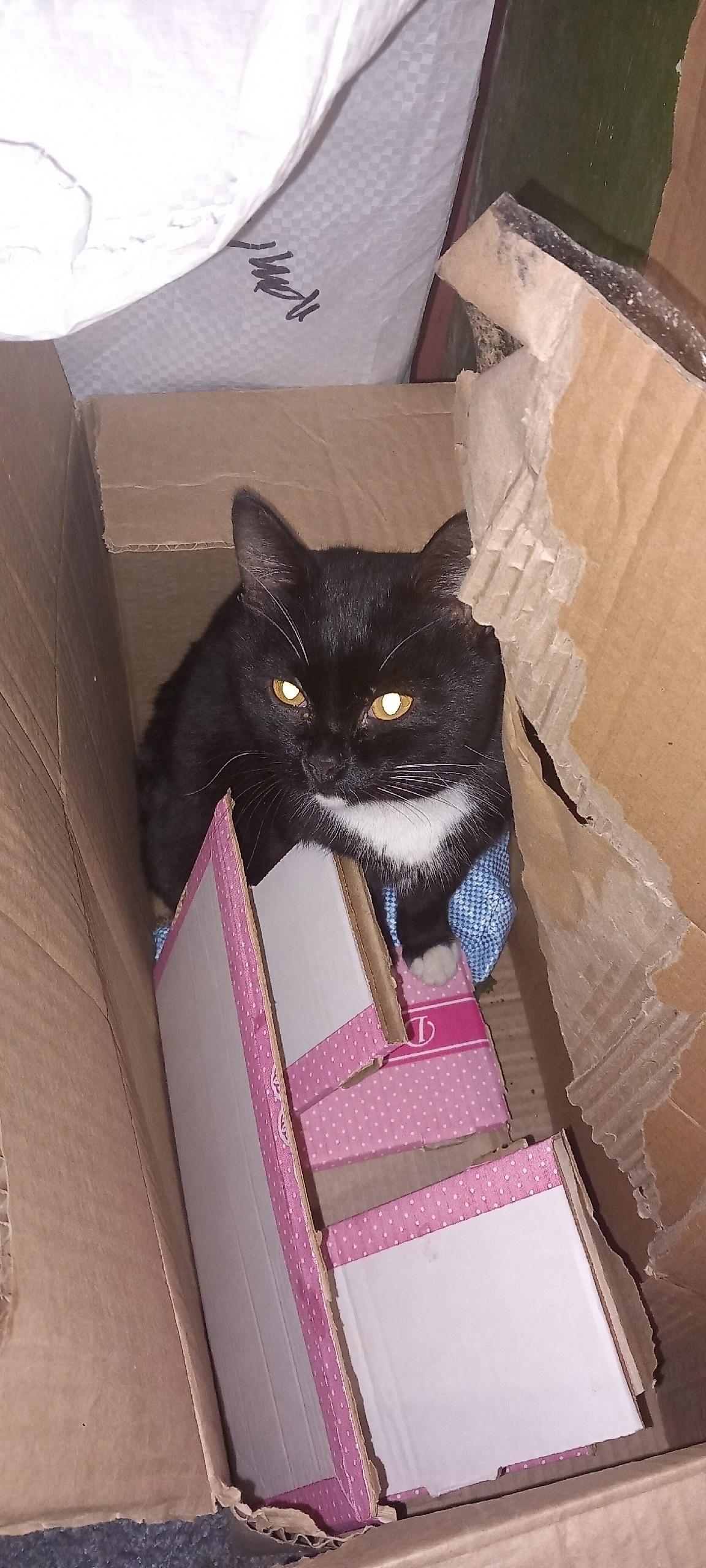 Кот соседкий, но они его выбросили на улицу (по их словам метит всё в доме),домой не пускают, не кормят.
