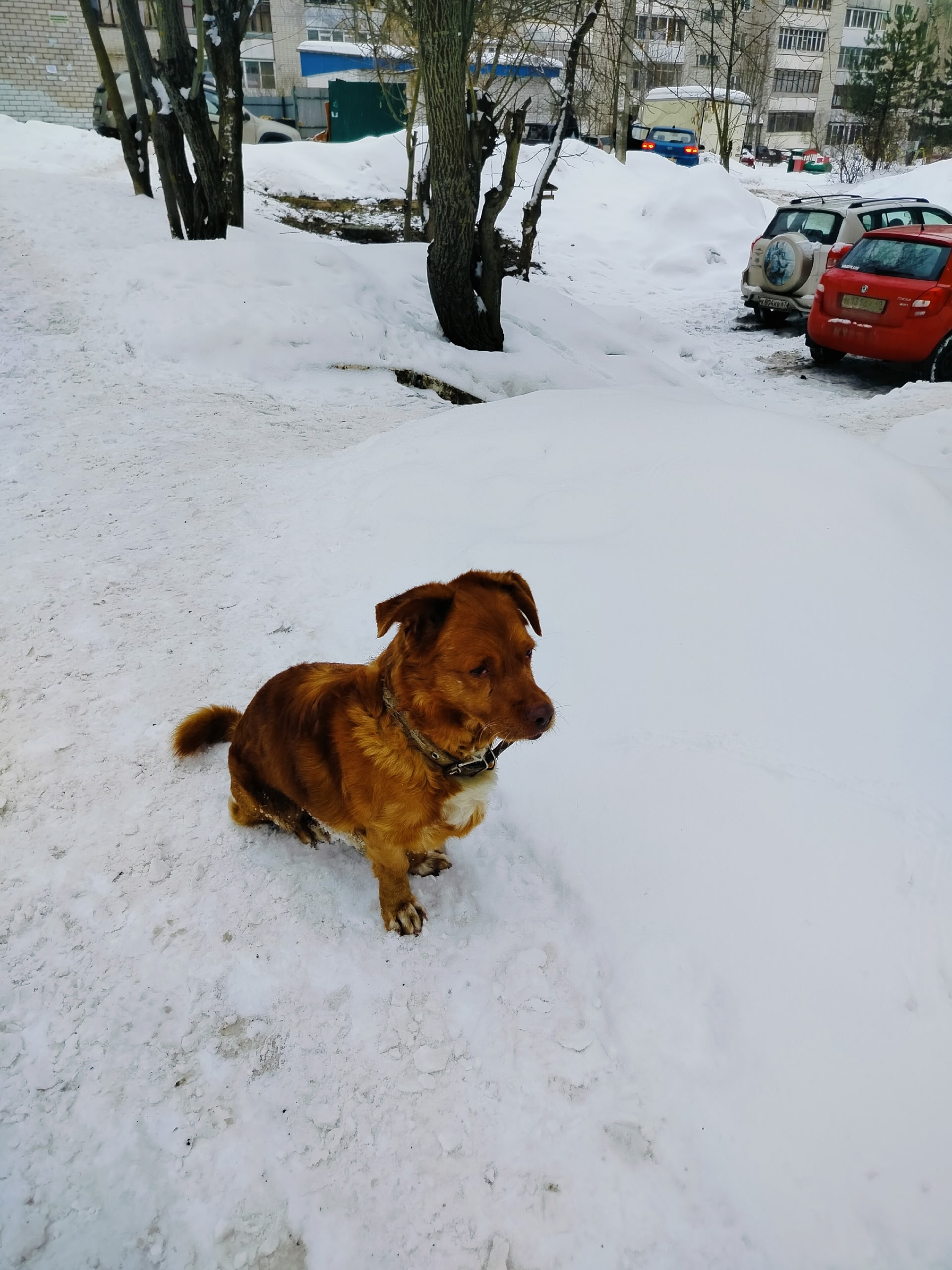 Хозяин найдись!!! Собака рыжего окраса(девочка) с ошейником. Сидит..