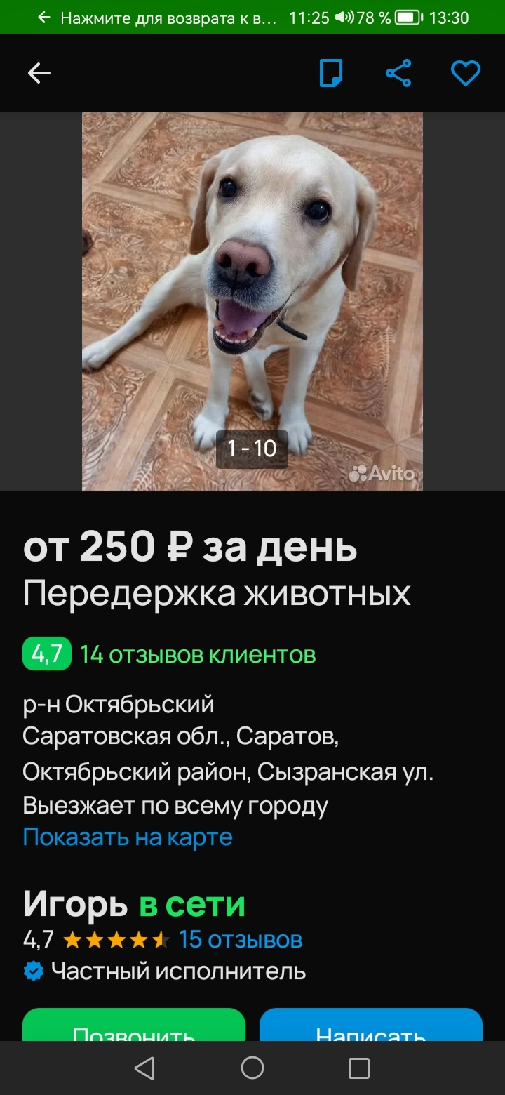 Отдавали, на передержку свою собаку. Зовут “специалиста по животным” – Игорь. Наш пёсик убежал от него и он нам не сразу об этом сообщил. На авито у него все отзывы на 5.На самом деле боится собак и он не умеет налаживать контакт с животными. В итоге мы не поехали, потеряли задаток за поездку. 1,5 суток мы провели в Агафоновке, в поисках своего сыночка, слава богу нашли. Лапки повреждены, а этому товарищу по барабану. Пишет мне, чтоб удалила отзыв. Такими вещами должны заниматься люди, которые любят животных, а не просто способ заработка денег. Если бы мы не нашли нашего Макса, в дальнейшем он вряд ли был бы жив, погиб бы или от холода или от голода.