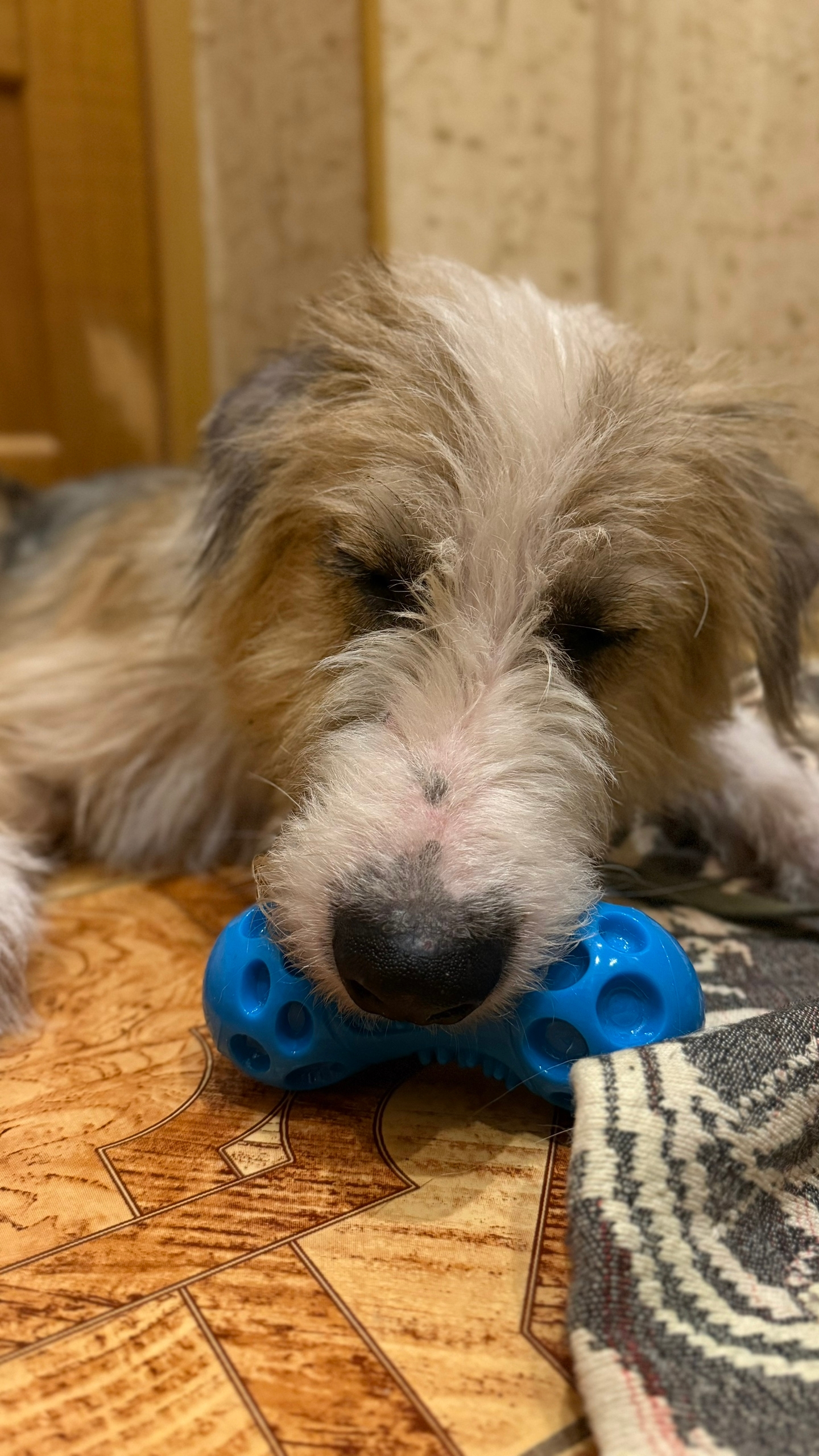 Сейчас пёс находится у нас. Однако, к сожалению, у него очень мало места, сидит в тесном коридоре.