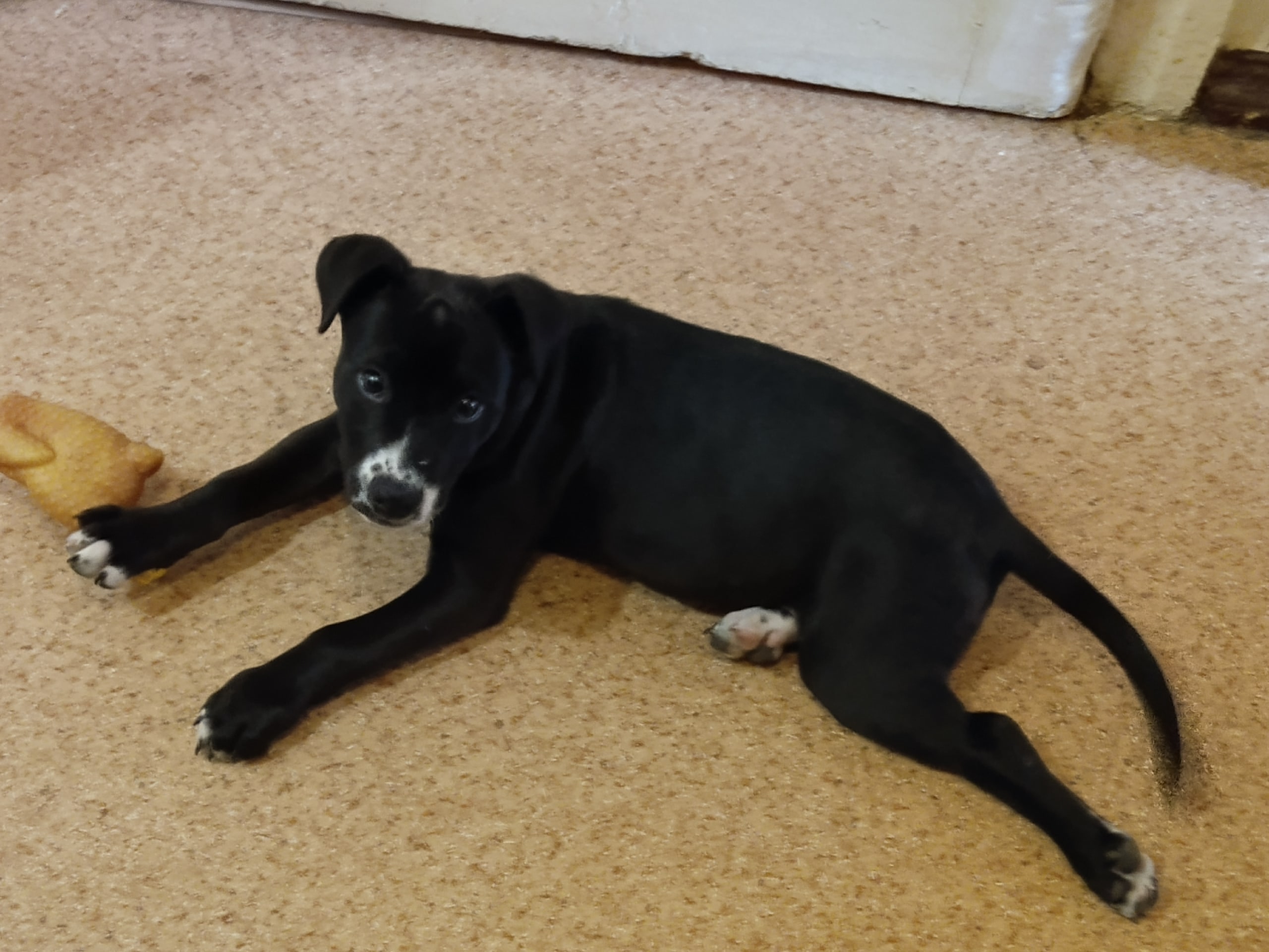Окрас черный с белыми пятнами.