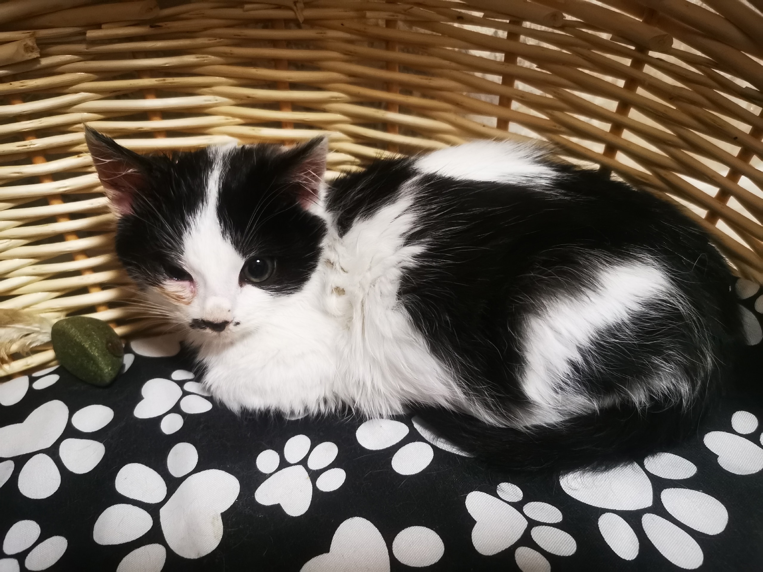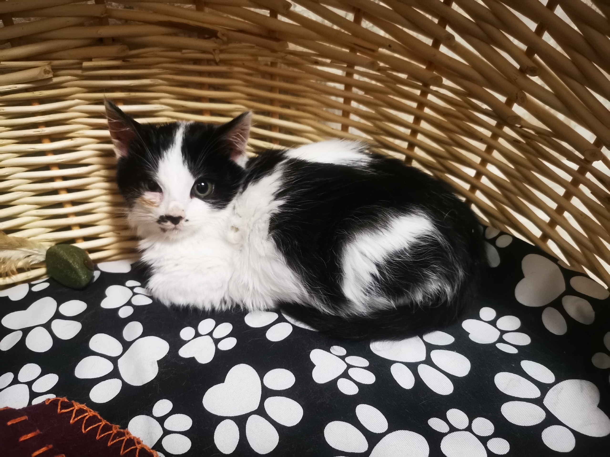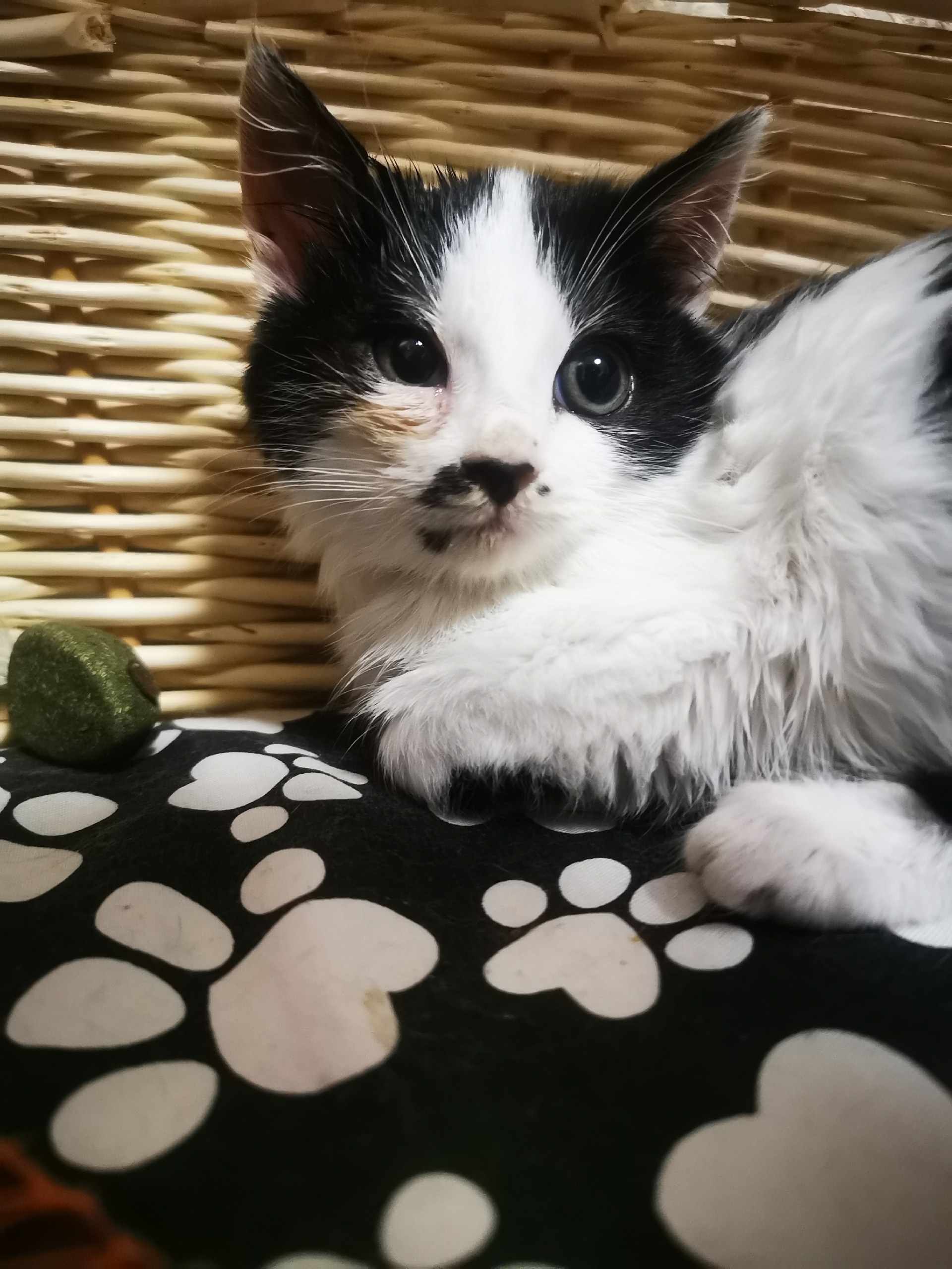Свозили к ветеринару, мальчик биколор от 1 до 2 месяцев, обработали ,глаза капаем,немного порвано ухо .