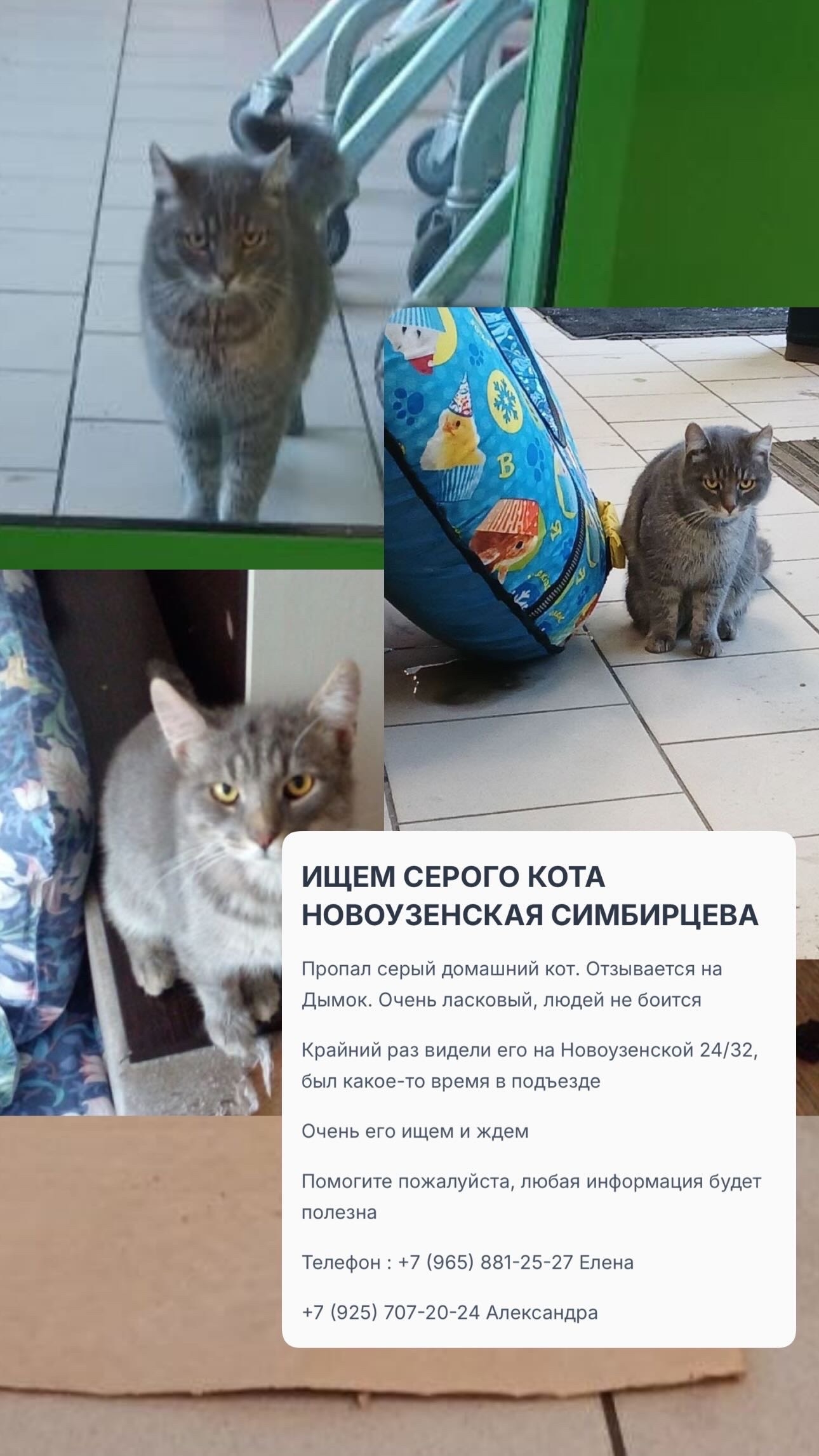 ИЩЕМ СЕРОГО КОТА, отзывается на Дымок !