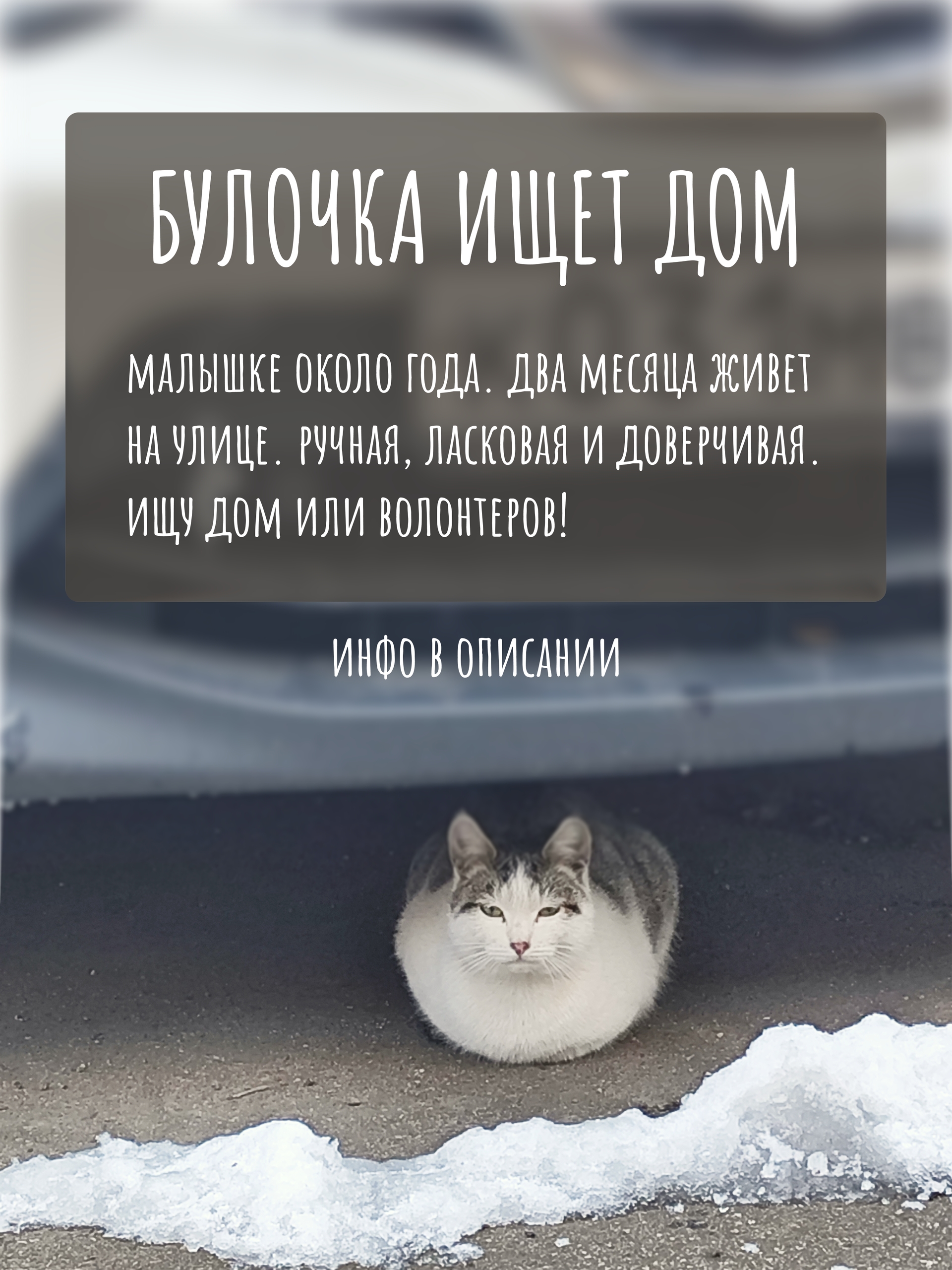 Ищу волонтеров или добрый дом для молодой уличной кошки (примерно годик). Она очень ласковая, тянется к людям, доверяет и обожает погладушки. Кошка беременна, и с наступлением холодов шанс котят выжить практически нулевой 🙁 Уже подкармливаю ее и заказала домик для зимовки, этого, увы, мало. Но это все, что я могу себе позволить, тк у самой кошка на лечении.