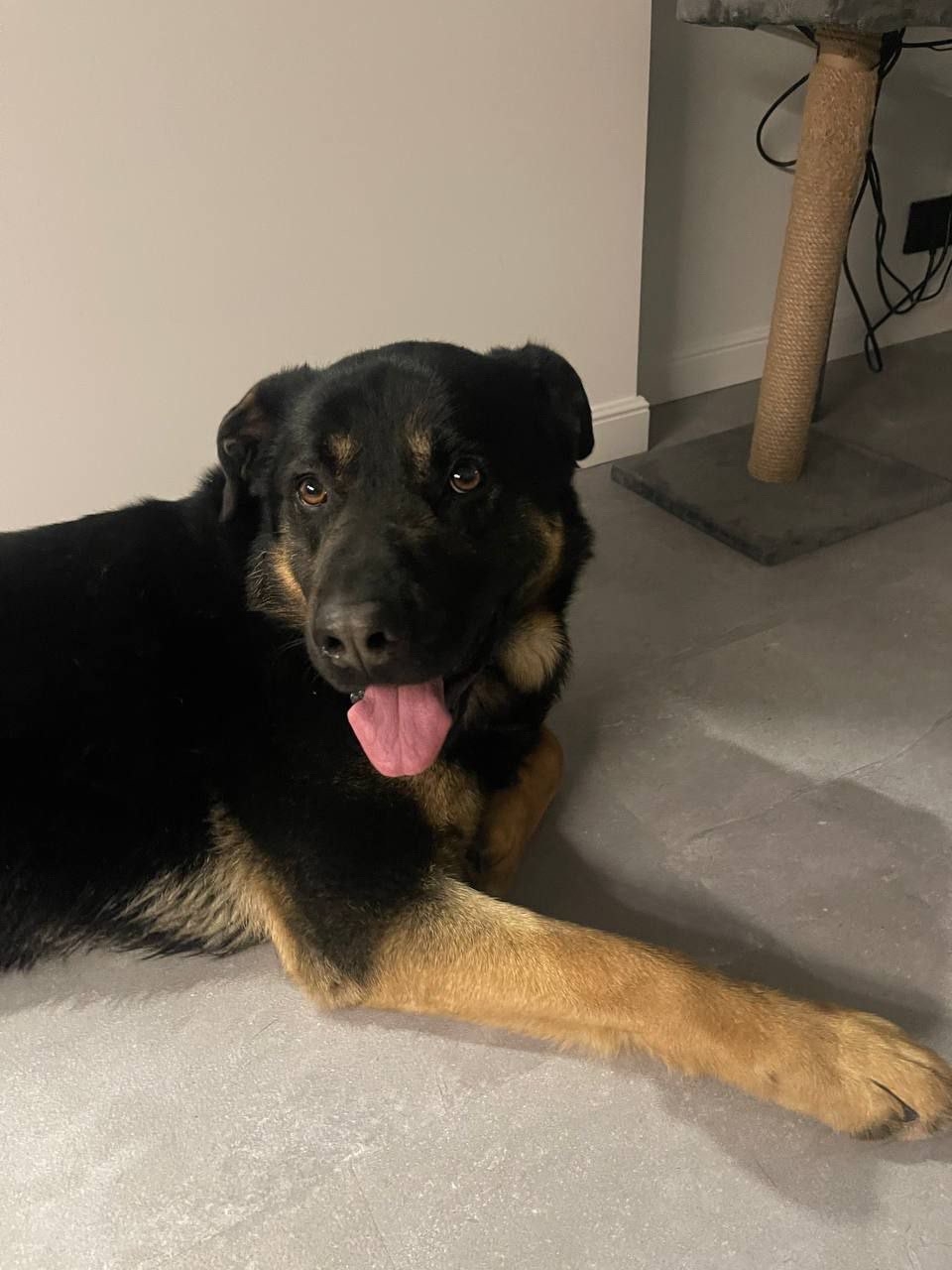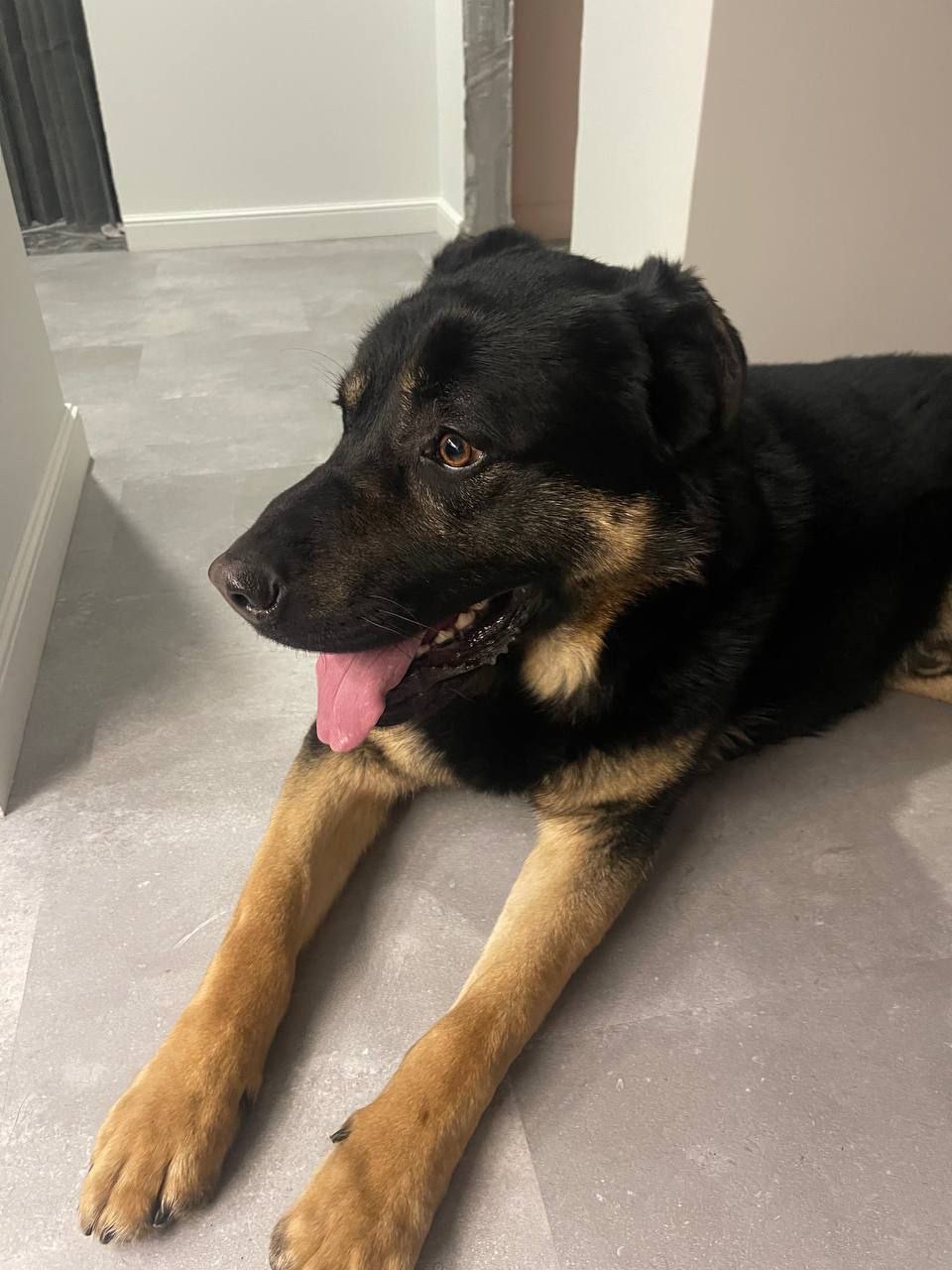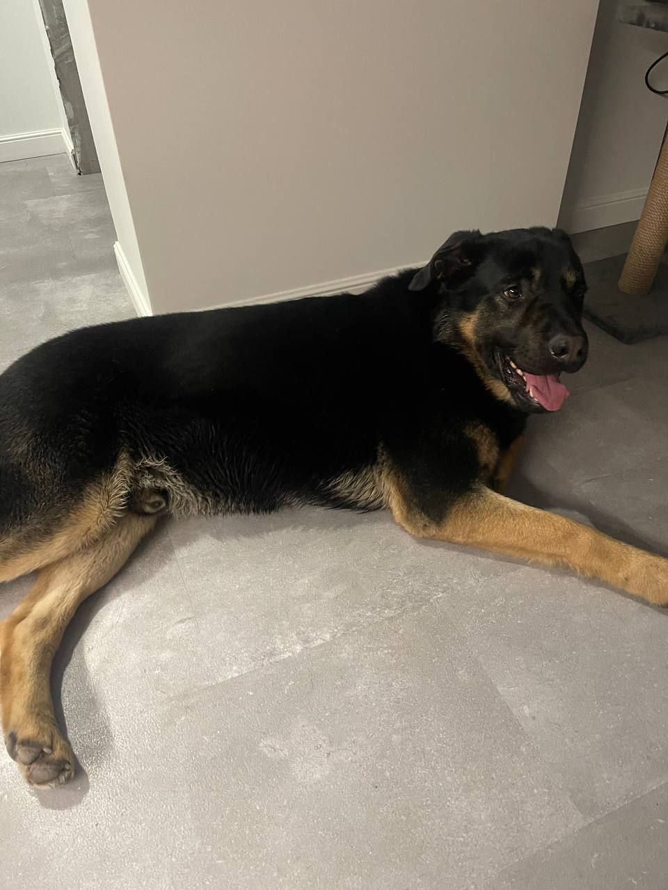 Кобель крупный (по породе, думаю овчарка) лапы крупные, ухоженный, красивая блестящая шерсть, подстрижены когти, ушки чистые. Молодой ( предположительно до двух лет) очень контактный, игривый, любит детей.