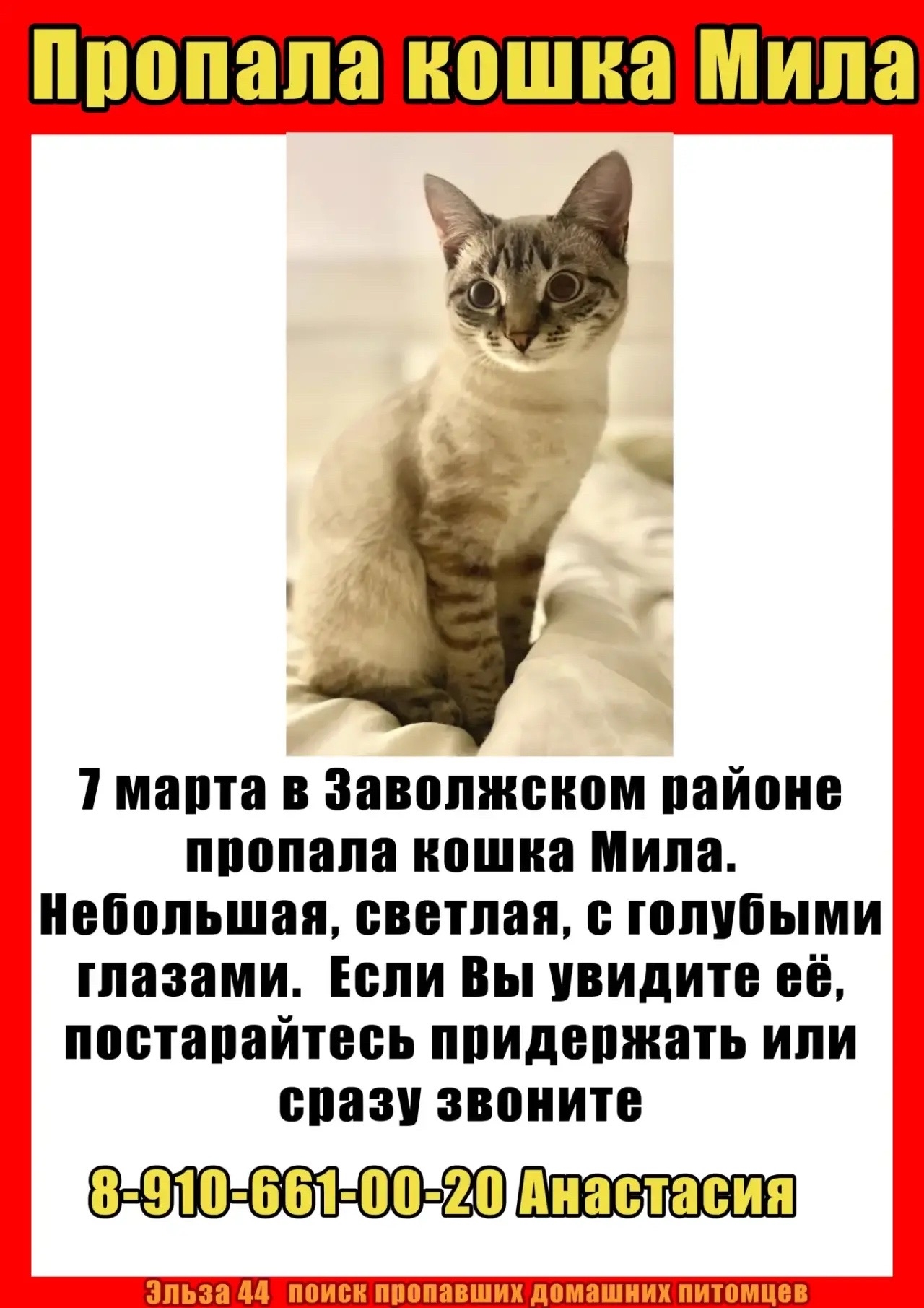 Посмотрите пожалуйста по сторонам, может именно Вам она попадется по пути на работу или домой 🙏