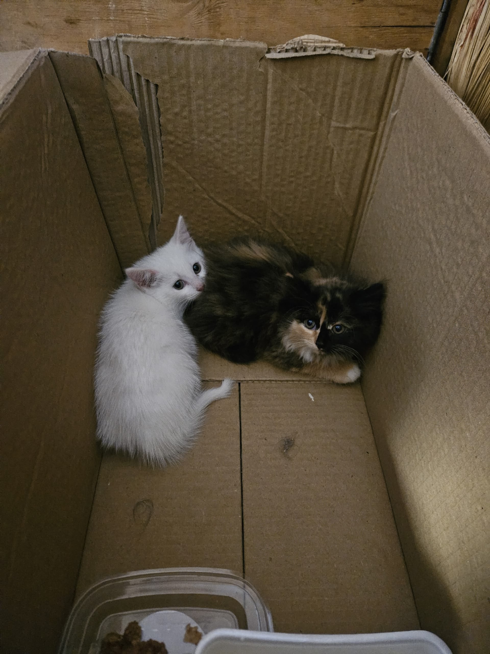 Котикам нужны добрые руки, живут сейчас на заводе. Одна белая девочка, другая трехцветная девочка, очень пушистая. Ласковые, на ручках сидят