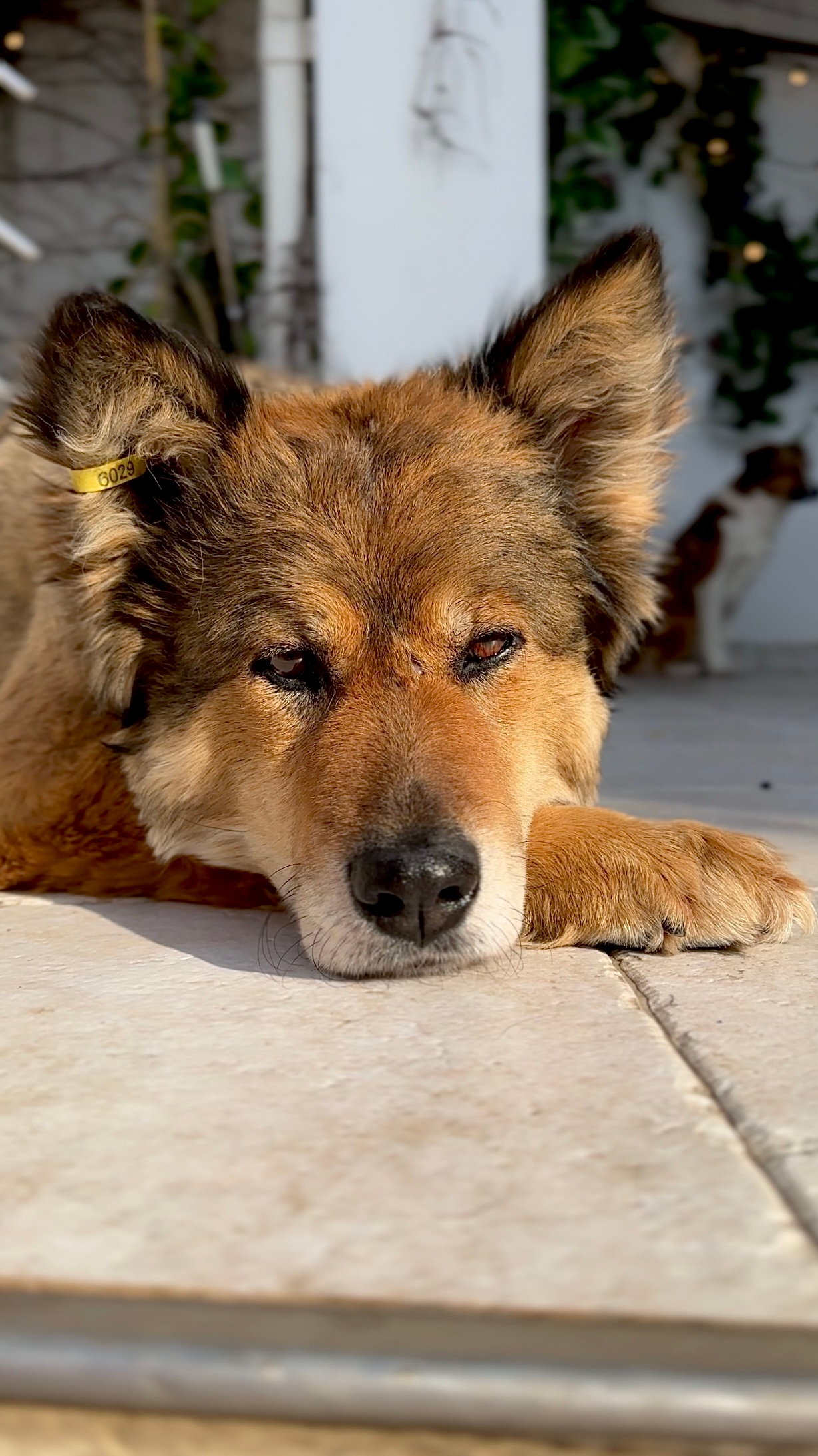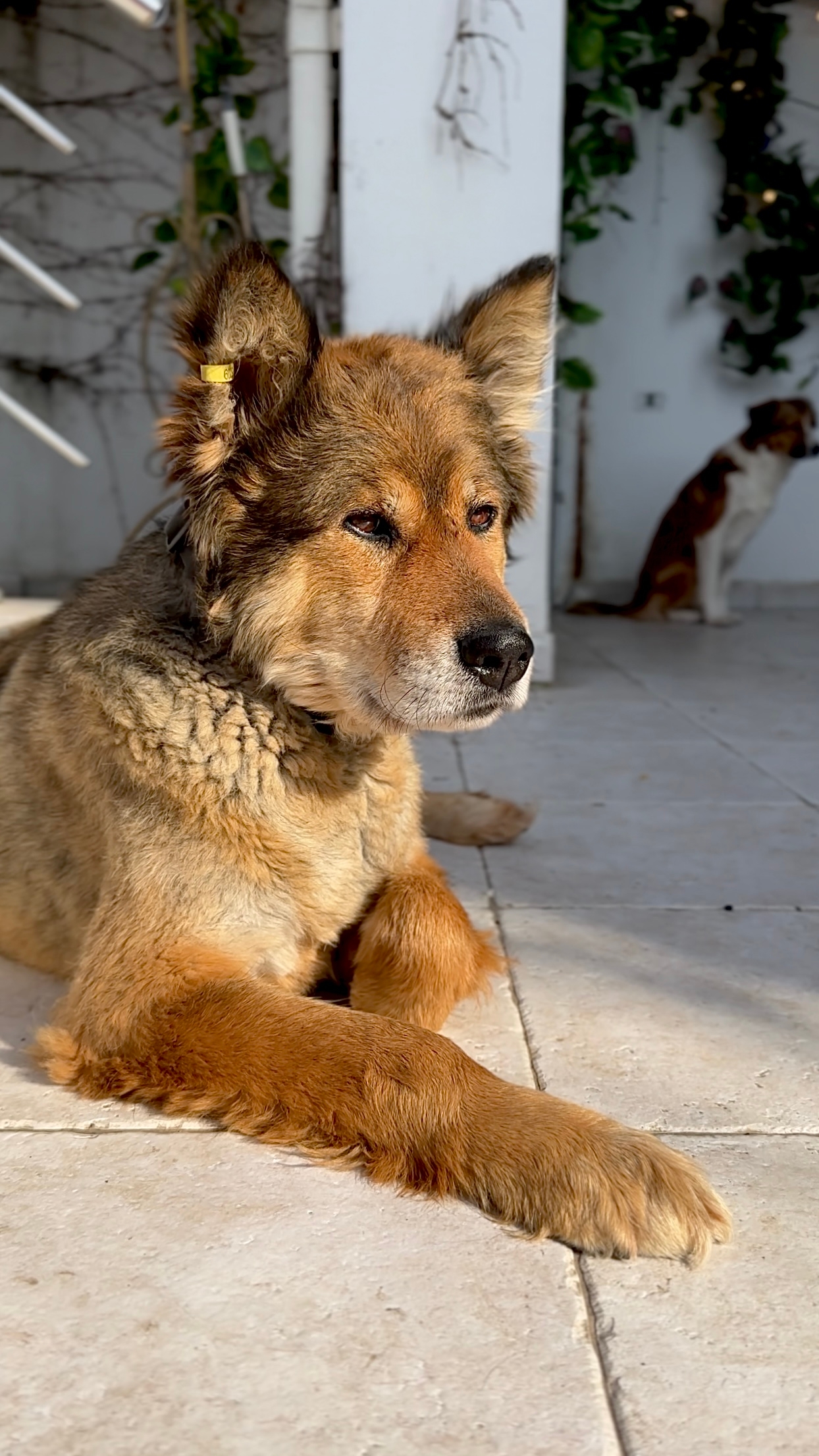 Нашли его со сломанной лапой . Сколько он провел в таком состоянии неизвестно. Операция была серьезная, сустава нет, лапа держится на металле. Он уже хорошо наступает на неё.