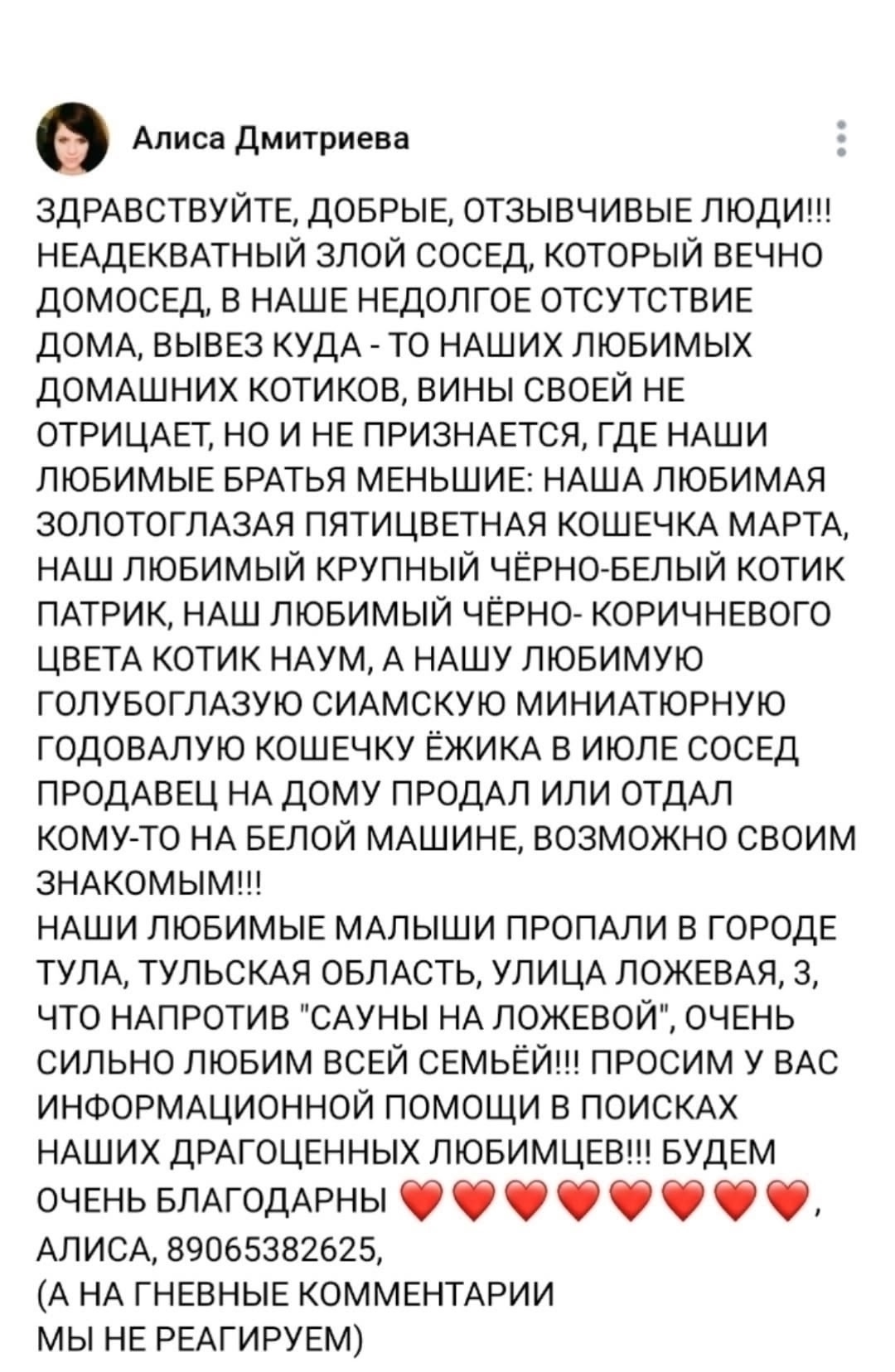 КРИК ДУШИ 🆘🆘🆘🆘🆘🆘🆘🆘🆘🆘🆘🔔🔔🔔🔔🔔🔔🔔🔔🔔🔔🔔🔔🔔🔔🔔Просим информационной помощи у всех неравнодушных в поисках 🆘🆘🆘🆘наших очень любимых домашних котиков, которые в июле в один миг пропали по вине злого неадекватного соседа, в наше недолгое отсутствие дома, А нашу голубоглазую безумно любимую малышку Ёжика тайскую сиамскую кошечку в июле сосед украл для своих знакомых и не скрывает этого ‼️‼️‼️‼️‼️По словам соседа-вора, увезли на белой машине, возможно: в Московскую область, но могли и куда угодно ‼️‼️‼️‼️‼️‼️‼️‼️‼️‼️когда наша любимая малютка гуляла у своего дома абсолютно счастливая, радовалась лету и ждала нас‼️‼️‼️‼️‼️‼️‼️‼️‼️‼️‼️‼️‼️‼️‼️‼️‼️‼️‼️‼️Переживаем очень сильно всей семьёй,