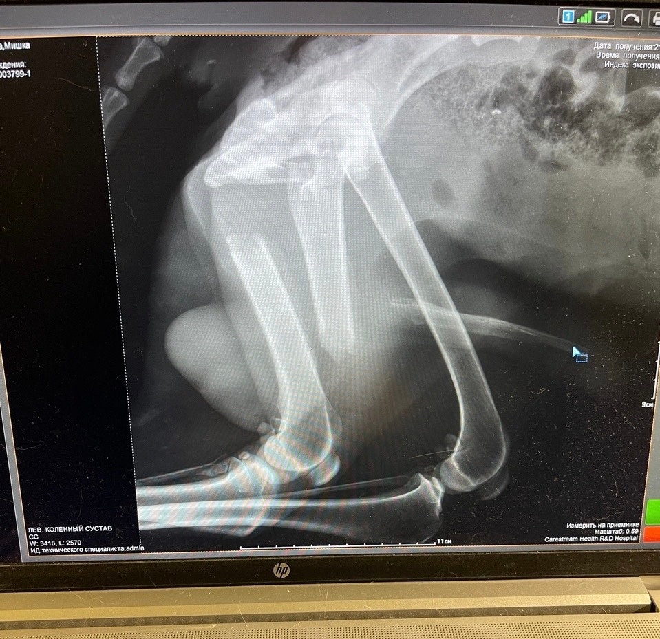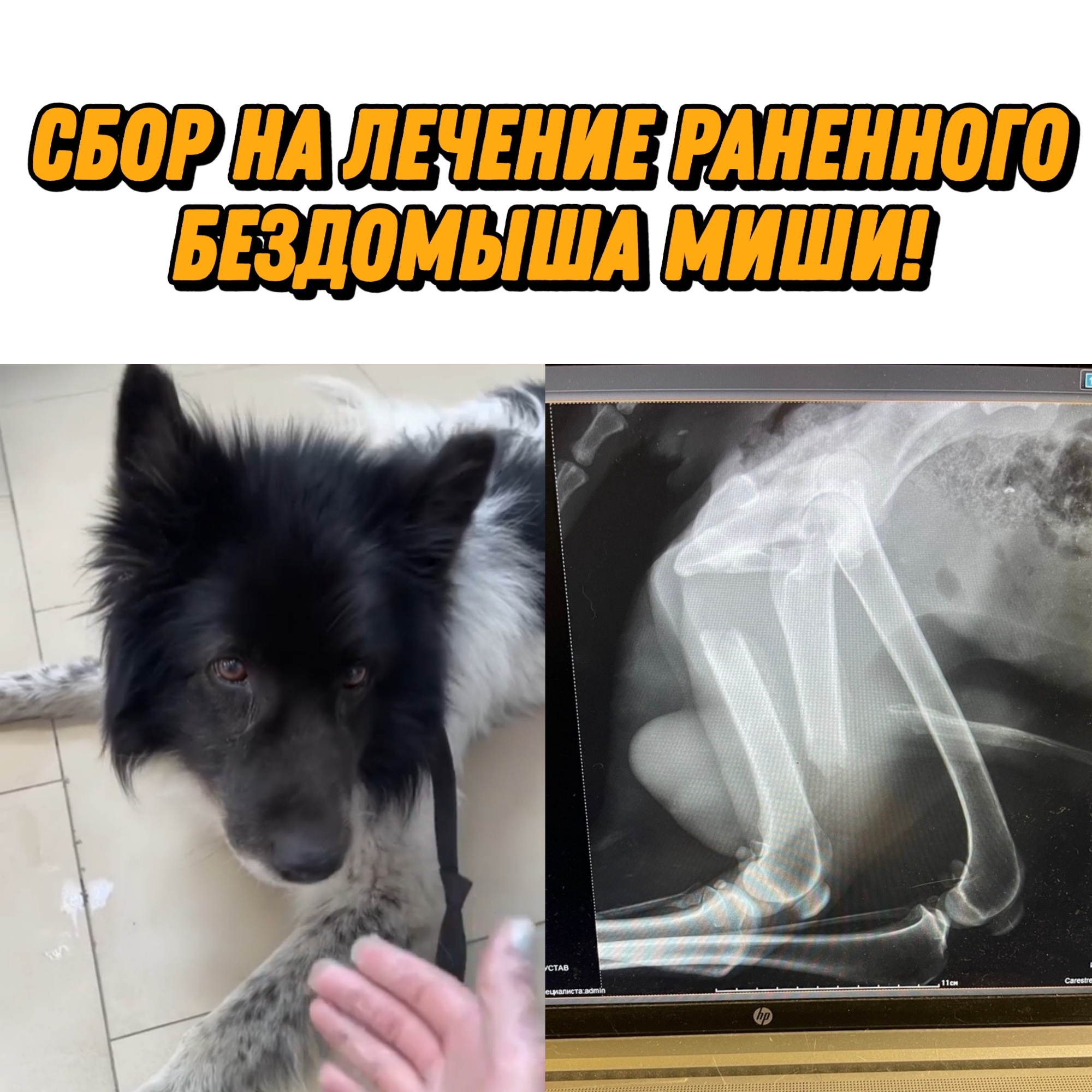 История Мишки такова: пёс безучастно лежал несколько дней на Пучковке, свернувшись калачиком. Сил ходить уже не было. Моя подруга детства [id237857644|Наталья Данилина], абсолютно неравнодушный человек и мама троих детей, имея на данный момент шесть своих собак, не смогла проехать мимо умирающего пса. Мишку повезли в ветклинику, сдали анализы и сделали рентген. Букет болезней полный: перелом задней лапы, ушибы всего тела, пироплазмоз, анемия, проблемы ЖКТ, обезвоживание.