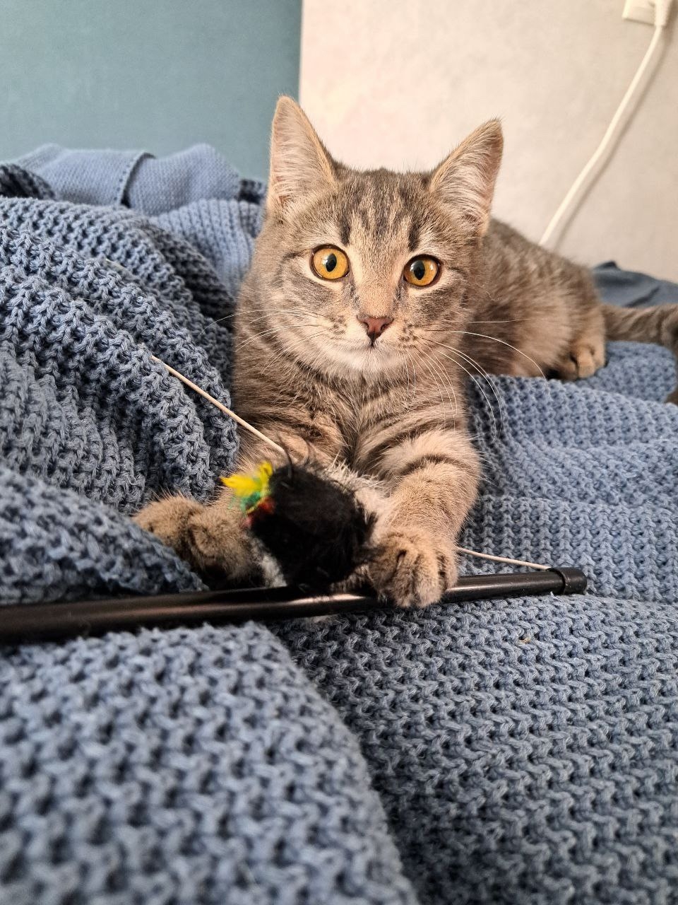 Была спасена с улицы. Обработана. Ходит в лоток. Кушает сухой и влажный корм. Ей примерно месяца 3-4.