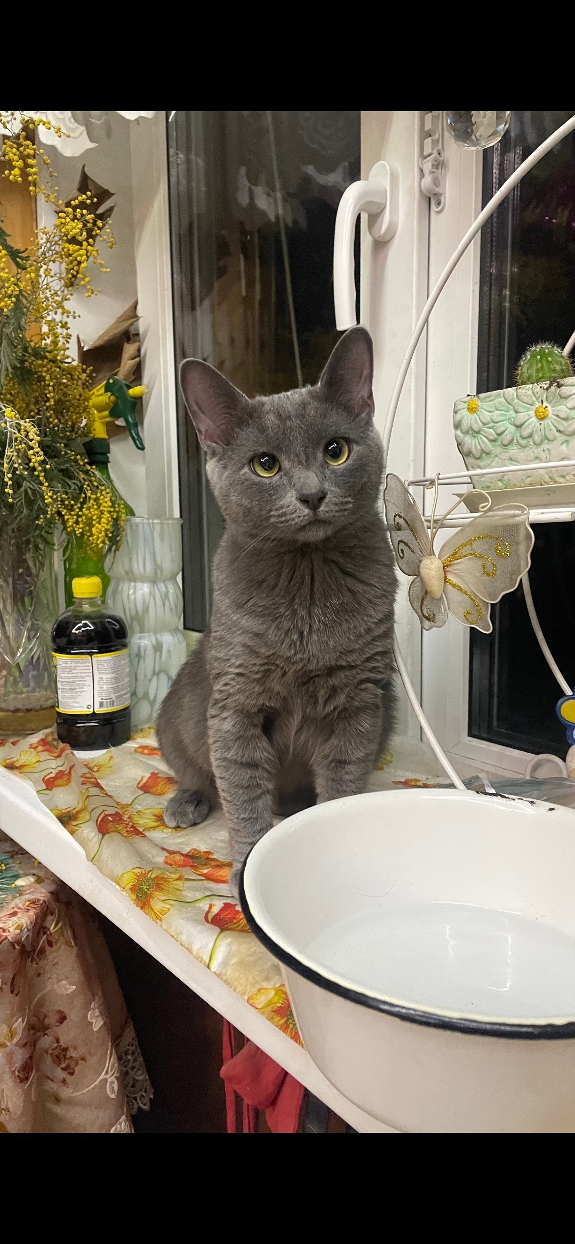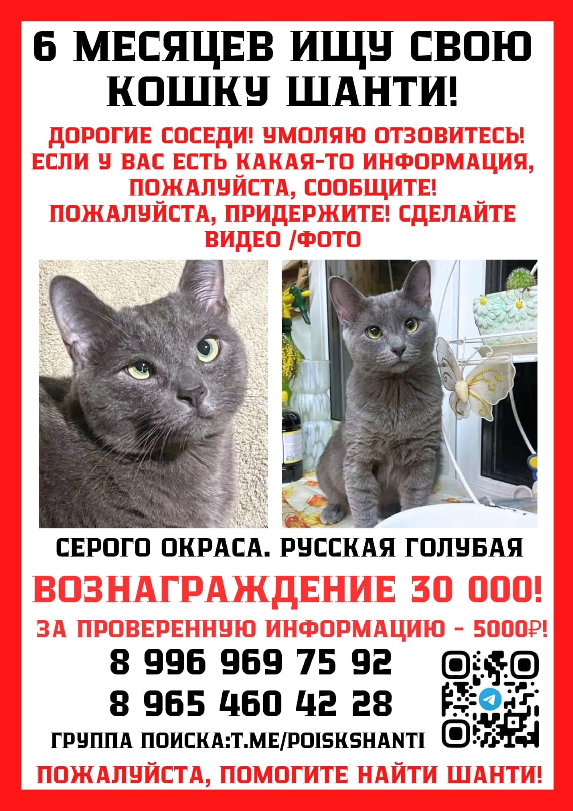Помогите найти Шанти! Окрас серый однотонный, фенотип русская голубая, 2 года, стерилизована. Есть особая примета – внутри глаза видно кровеносный сосуд!