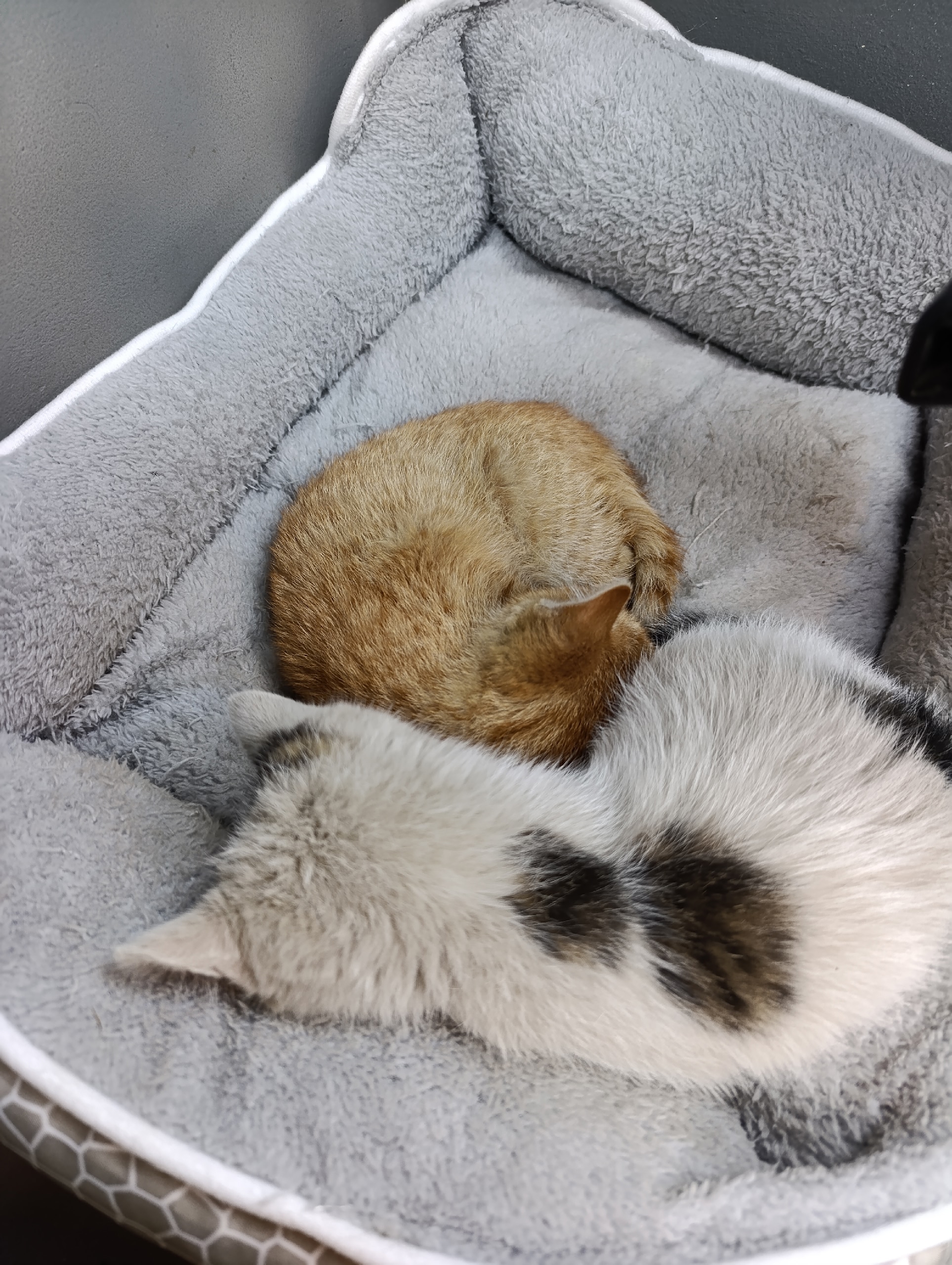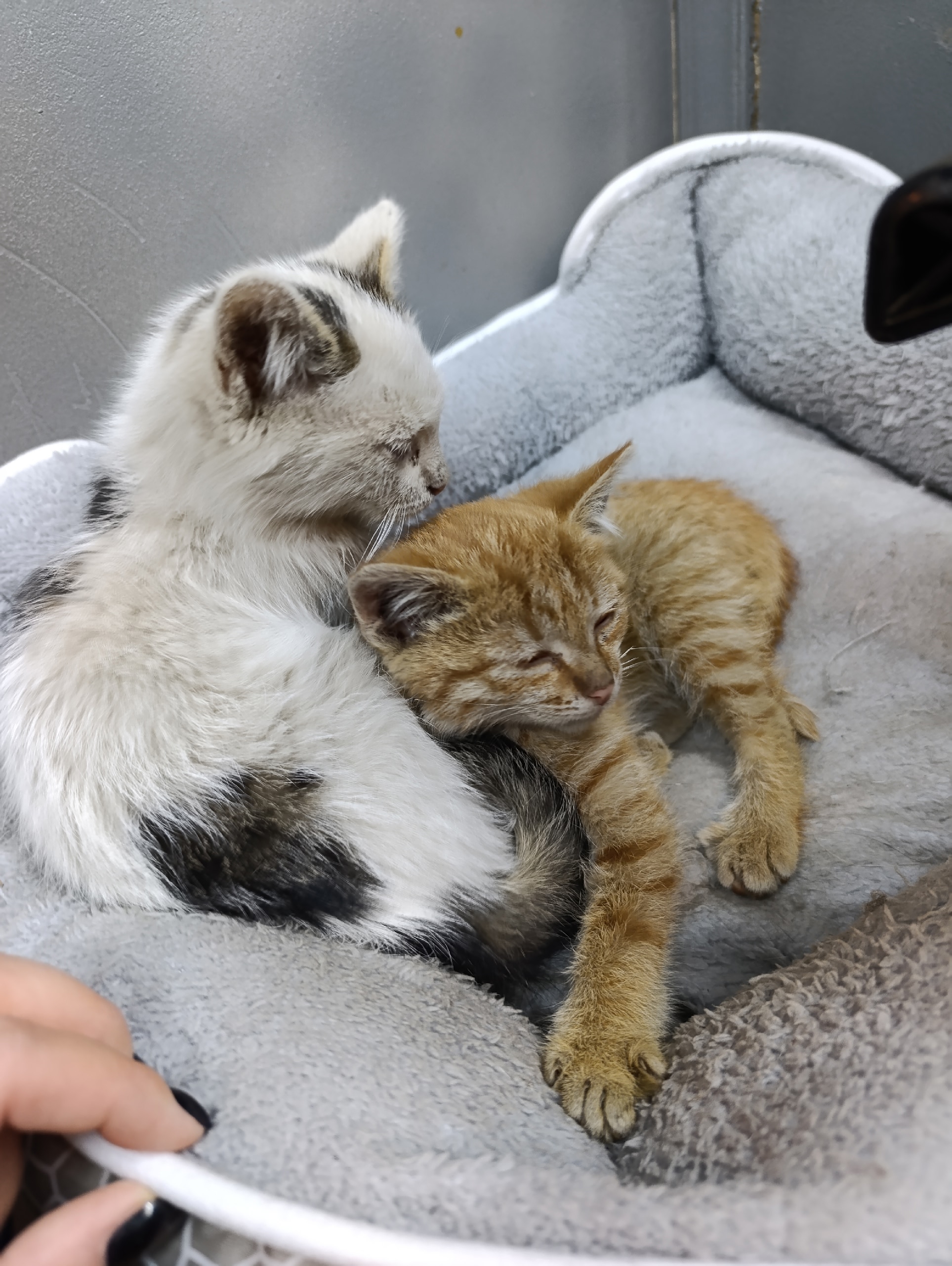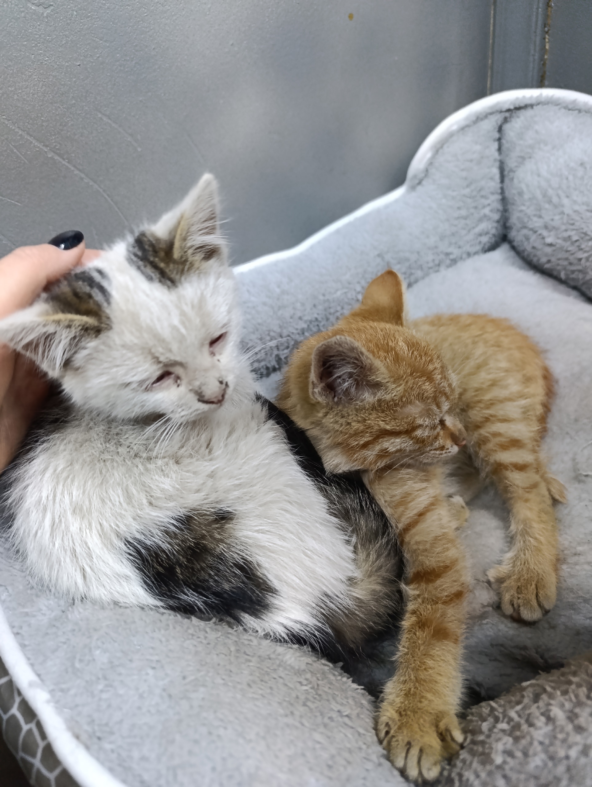 МО, Королев. На помойку выкинули двух котят. Ок. 1.5 месяцев. Белого взяли в семьи, две недели поиграли и вернули. Обработаны, пока в тепле и накормлены. Живут на шиномонтаже. Очень ищут дом. Желательно вместе, но можно и по отдельности. Очень ласковые и любят помурлыкать. P. S. Темные потому, что живут на шиномонтаже. 89104672130 Екатерина