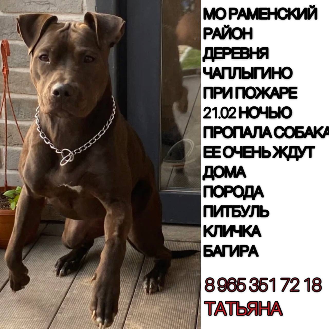 МО РАМЕНСКИЙ ДЕРЕВНЯ Чаплыгино ПРИ ПОЖАРЕ 21.02 ночью пропала.. Раменское Автор admin Опубликовано Фев 24, 2026 0 0 Поделится WhatsAppViberTelegramVKOK.ru МО РАМЕНСКИЙ ДЕРЕВНЯ Чаплыгино ПРИ ПОЖАРЕ 21.02 ночью пропала собака питбуль КЛИЧКА БАГИРА ЕЕ ОЧЕНЬ ЖДУТ ДОМА 89653517218 ТАТЬЯНА https://t.me/HvostatPatrul/215354 0 0 Поделится