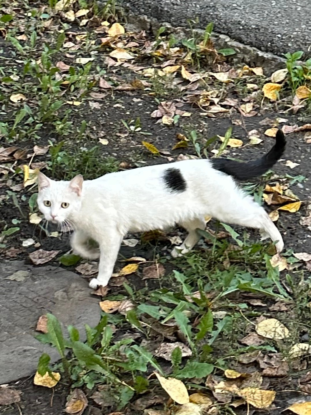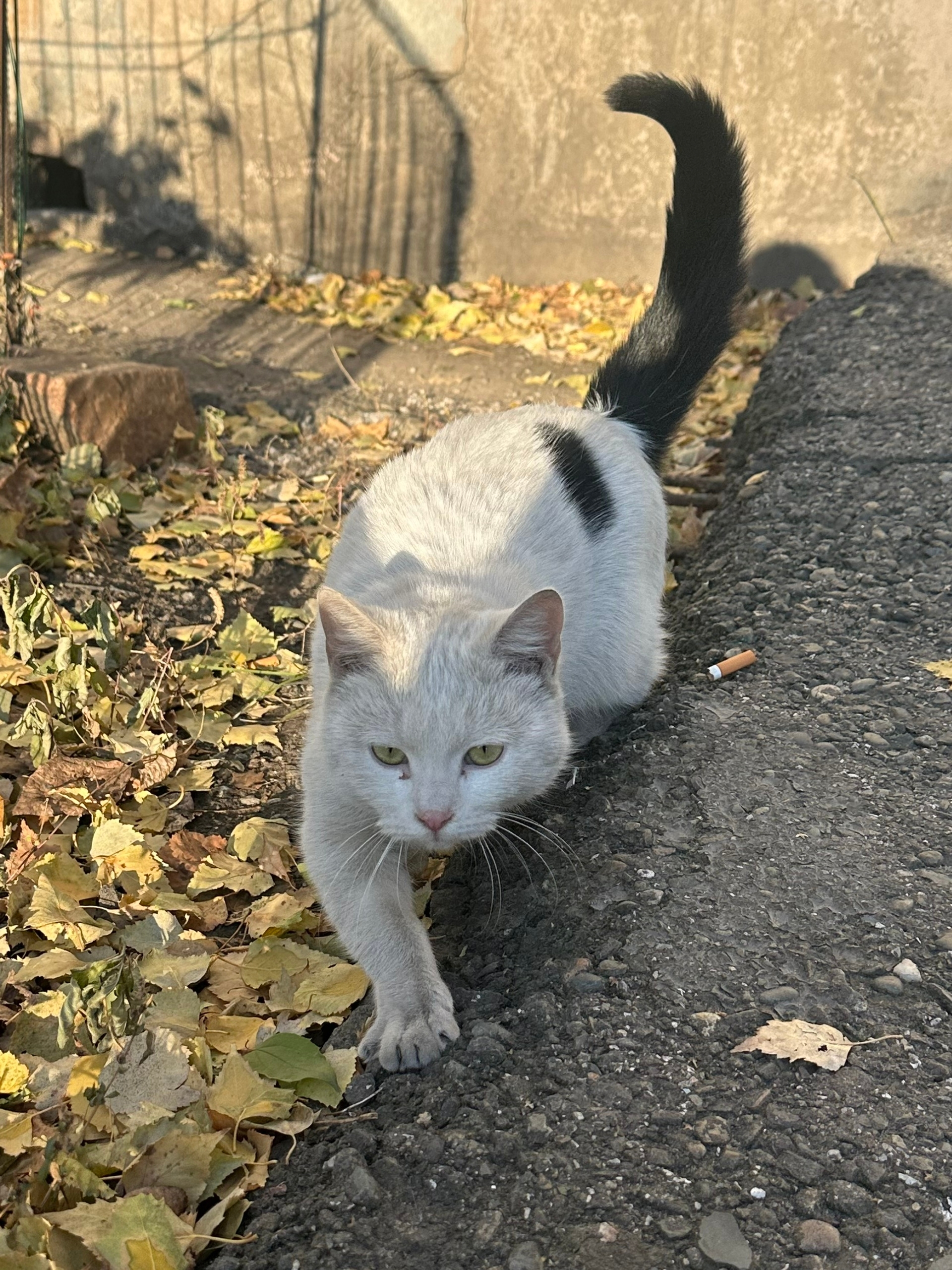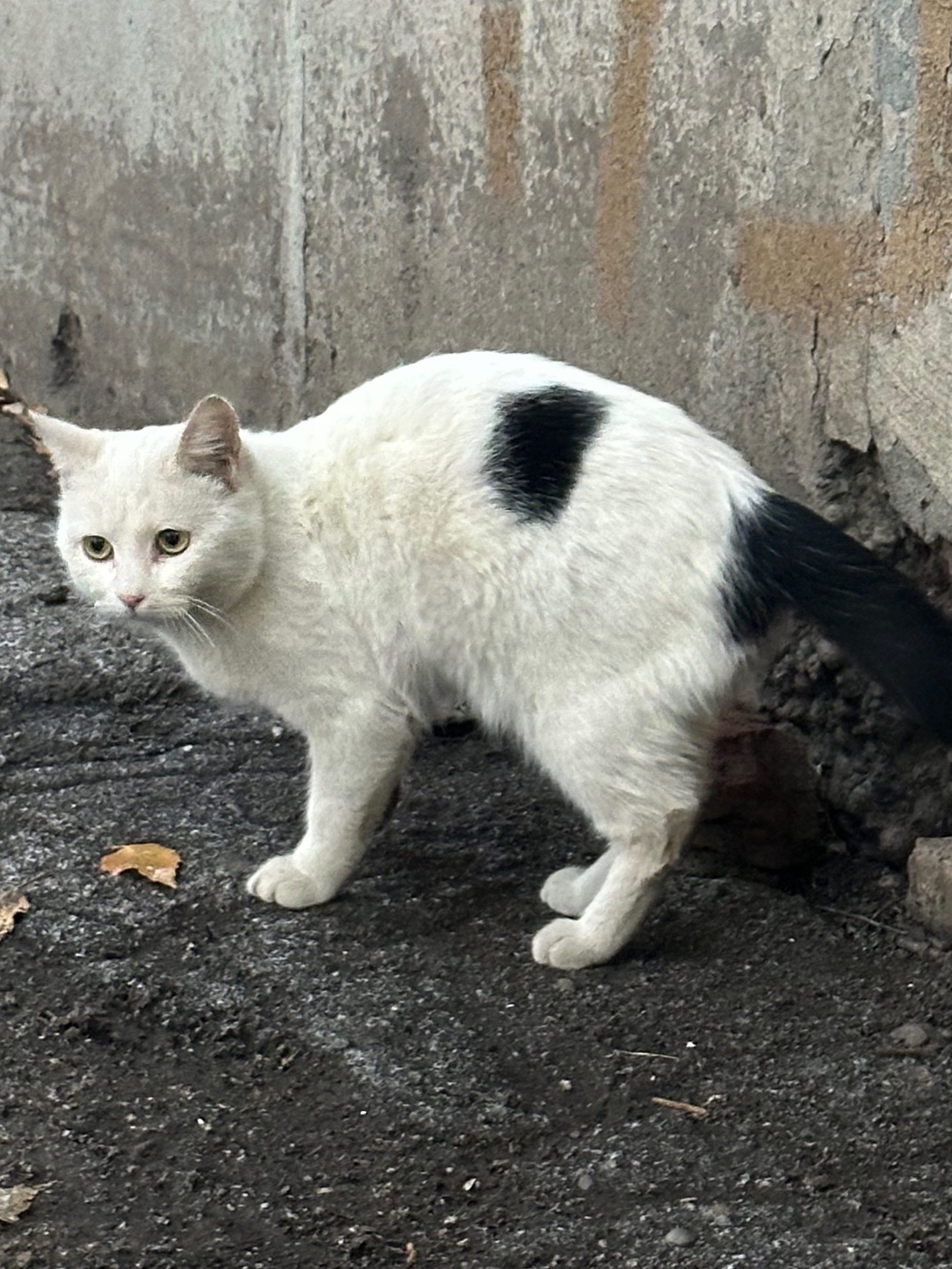 Полностью белый с черным хвостиком и пятнышком, с милыми наивными глазами малыш. Он боится людей, но если с ним подружиться, он очень ласковый, любит гладиться.