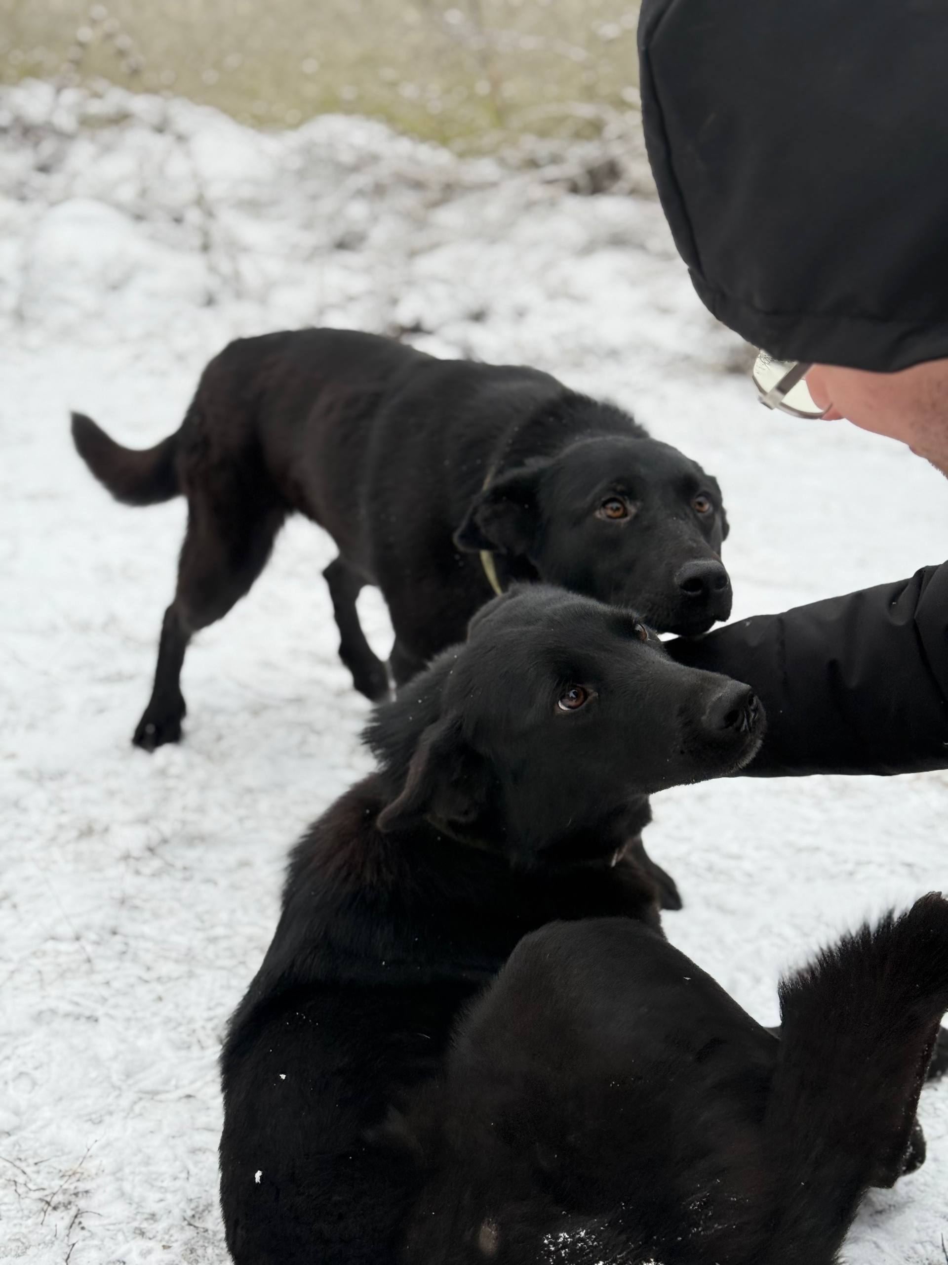 Характер у обоих игривый в силу возраста, но при этом хорошо понимают интонации в голосе, поддаются дрессировке. Очень ласковые и ориентированы на человека, скорее всего, бывшие домашние, кто-то наигрался и выбросил такую красоту 🙁