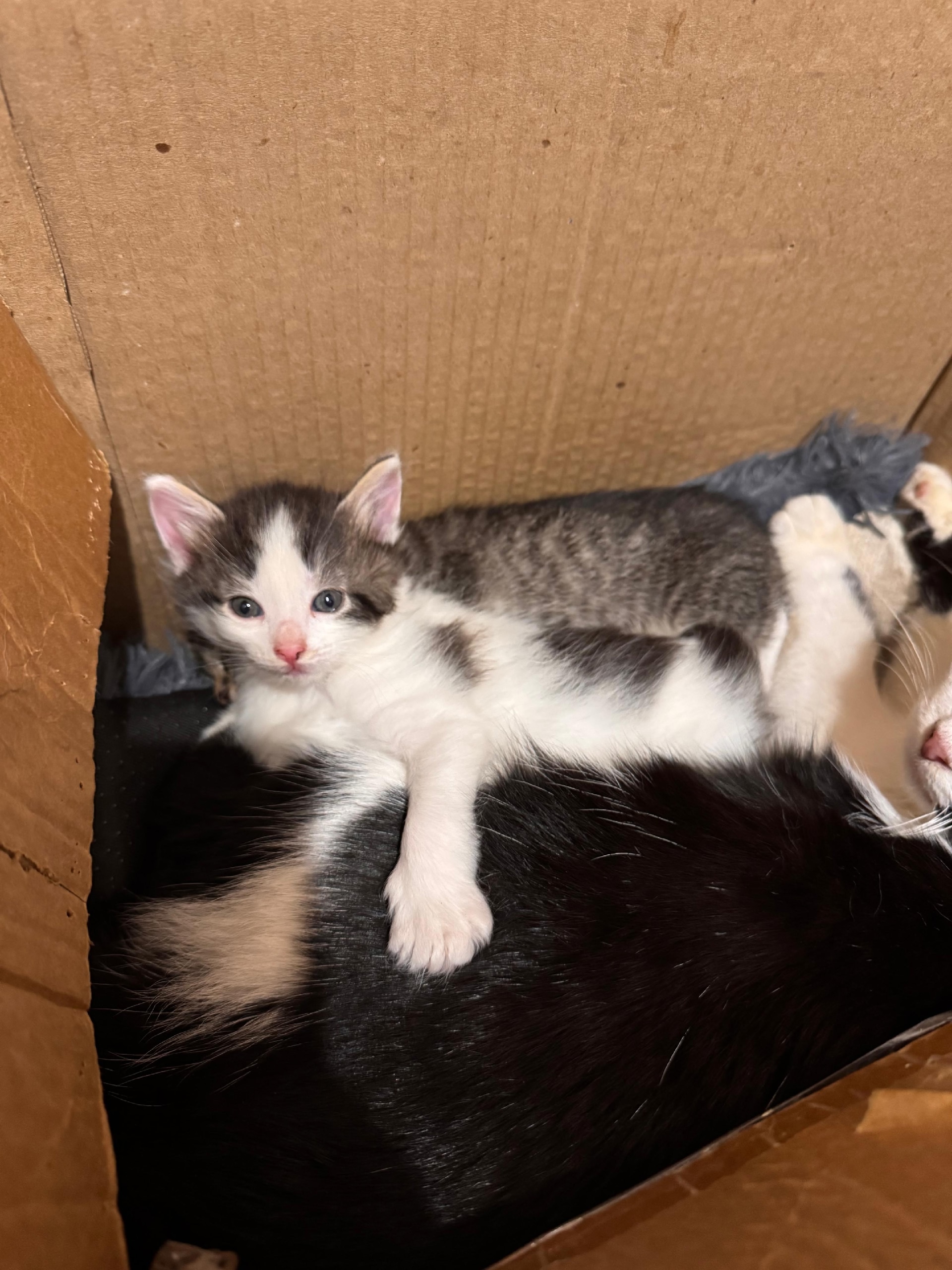Чёрно-белый пушистый и шустрый котик и девочка серого окраса, спокойная и тихая кошечка.