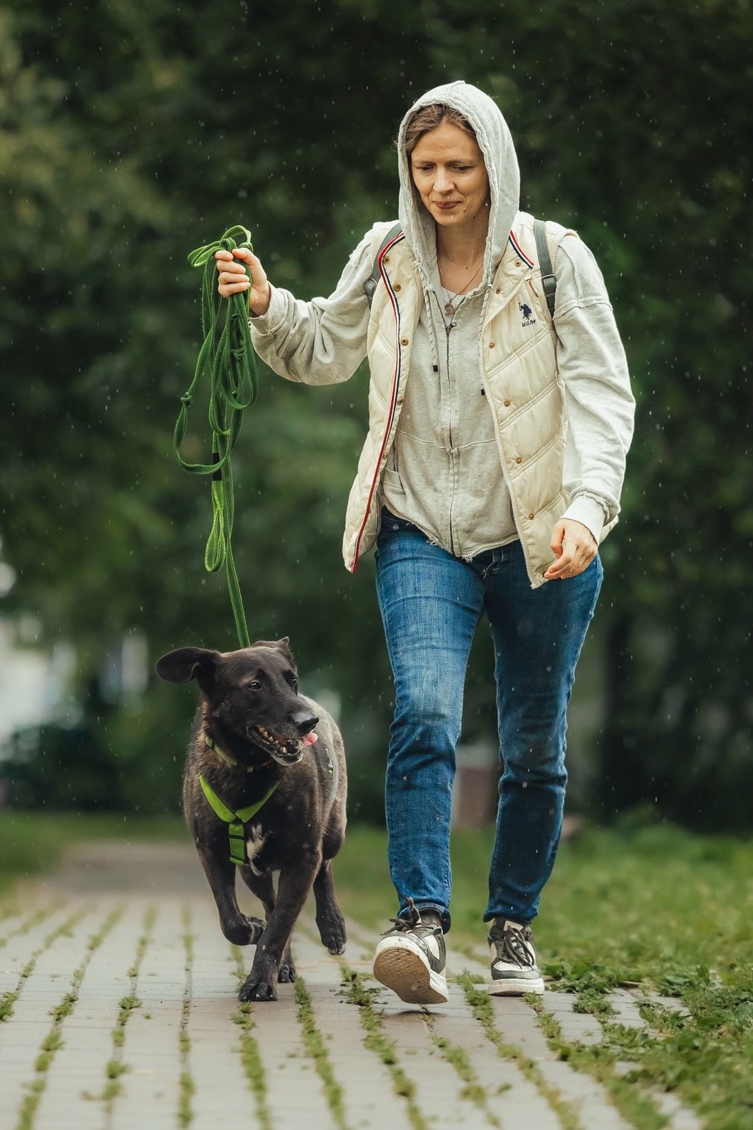 Он хорошо гуляет на поводке. На улице ведет себя скромно, но гулять очень любит. Далюше нужен проводник, который бы потихоньку исследовал с ним новые пространства и учил его быть смелее и увереннее.