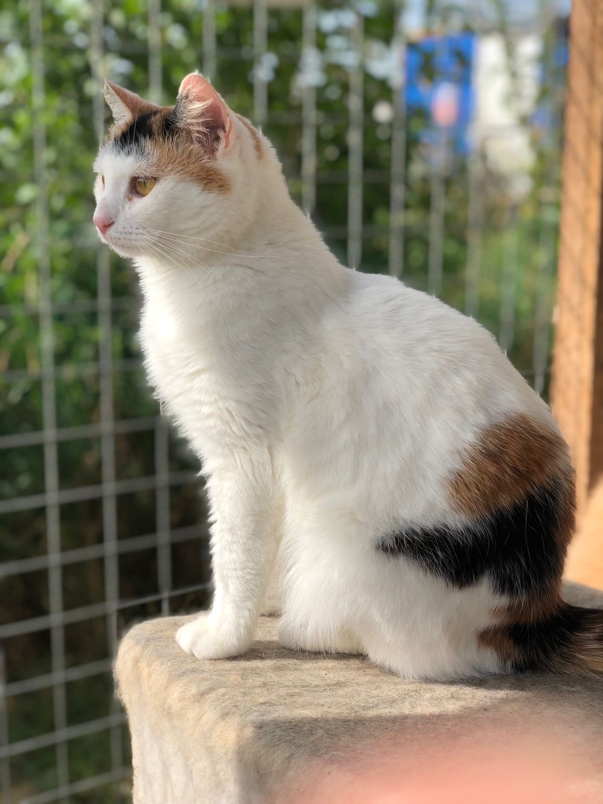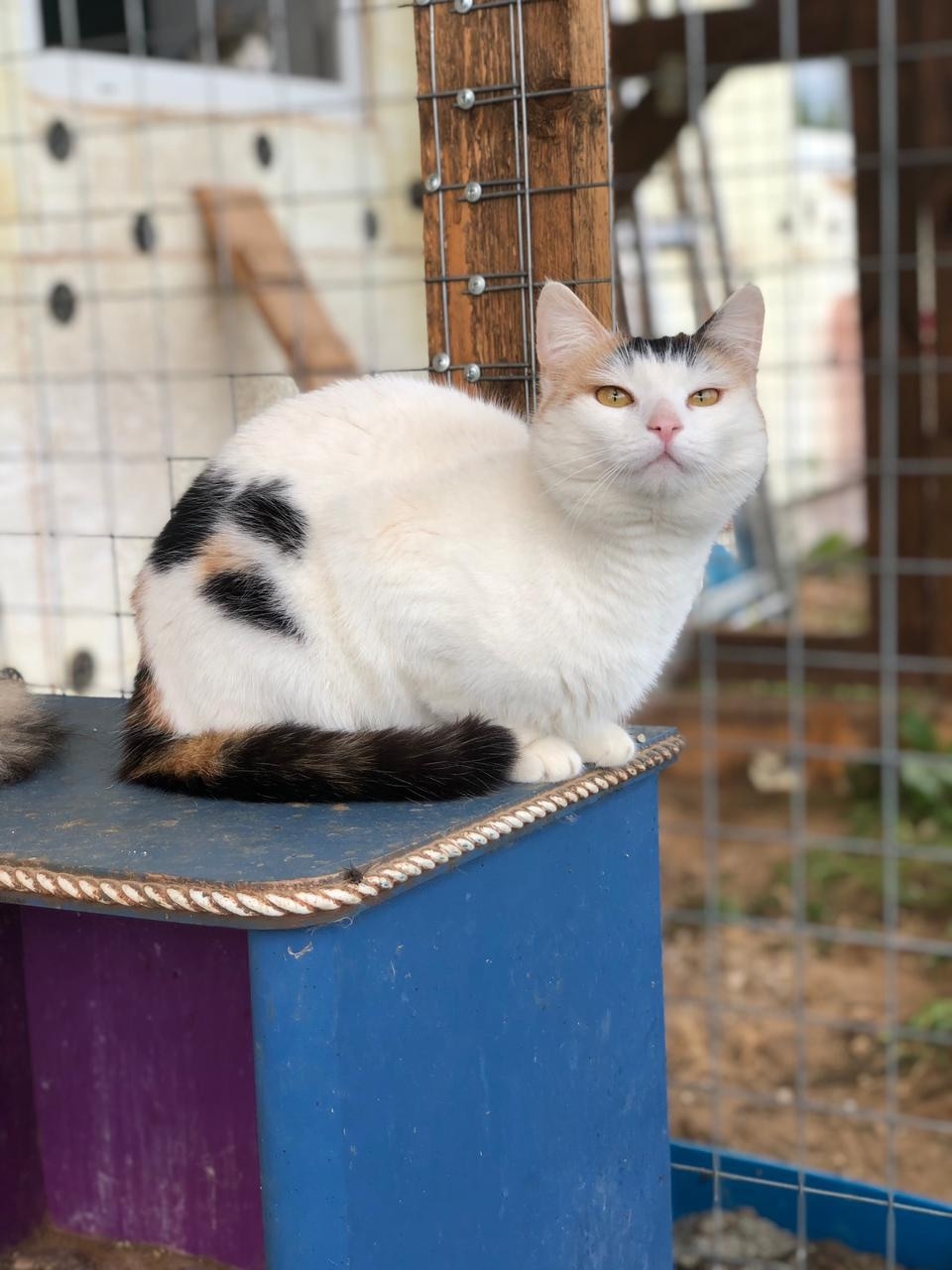 Ириске примерно около 2-х лет. Очень красивая трехцветка, хвостик у неё от природы чуть короче чем у обычных кошек и необычная расцветка шерсти.