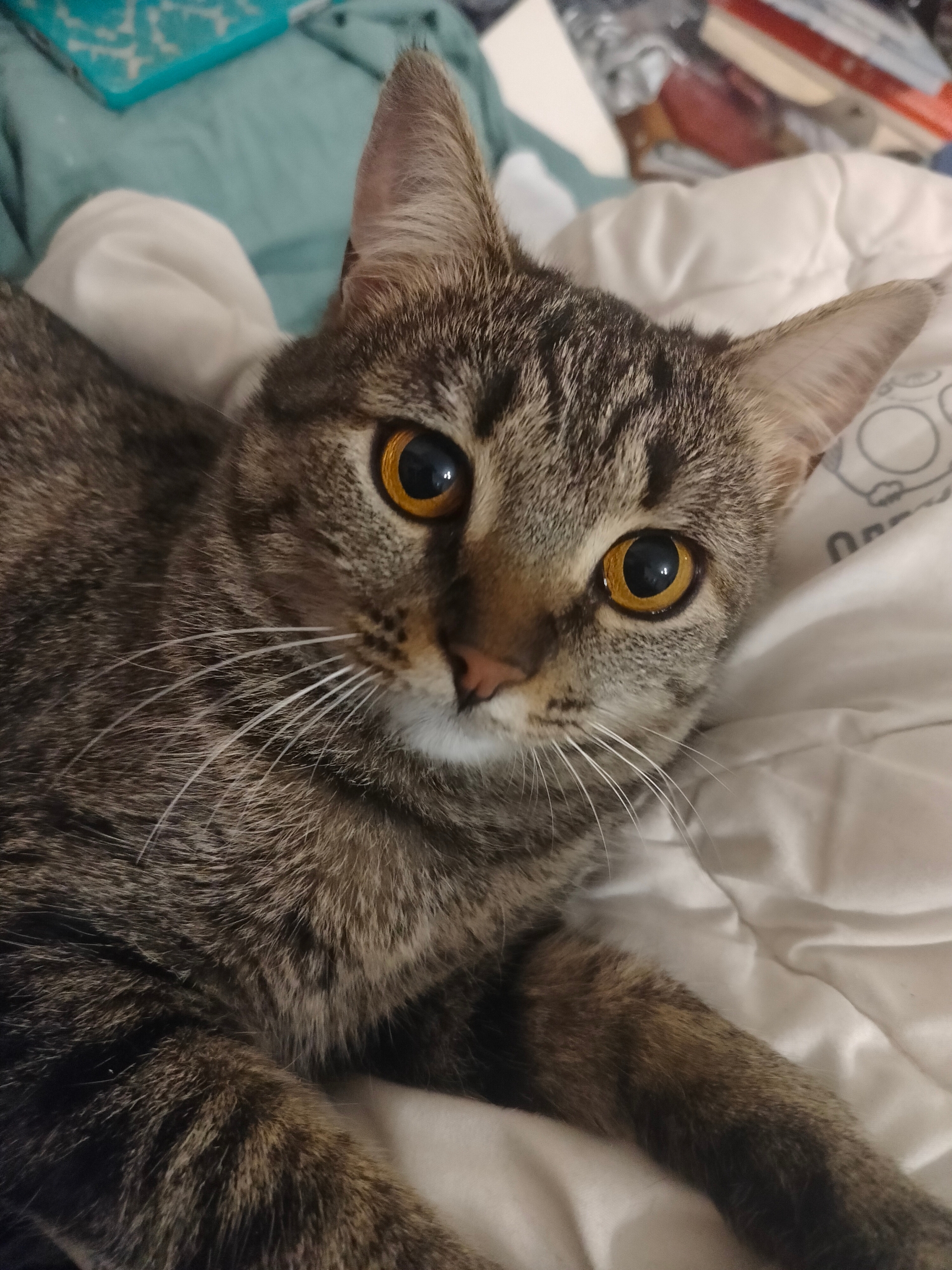 У Хлои очень яркие оранжевые глаза, явно есть помесь с какой-то породой. Также она несколько крупнее других обычных кошек. У неё длинные лапы и шея. Обследована у ветеринара, обработана от паразитов, привита, стерилизованна.