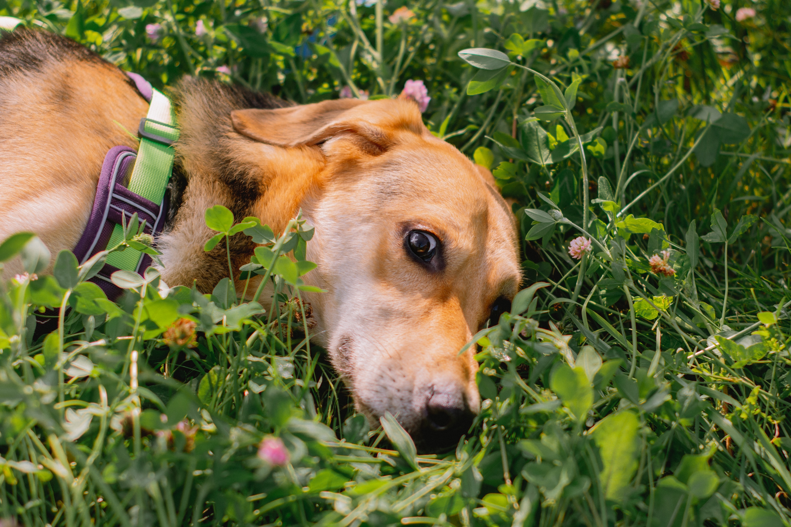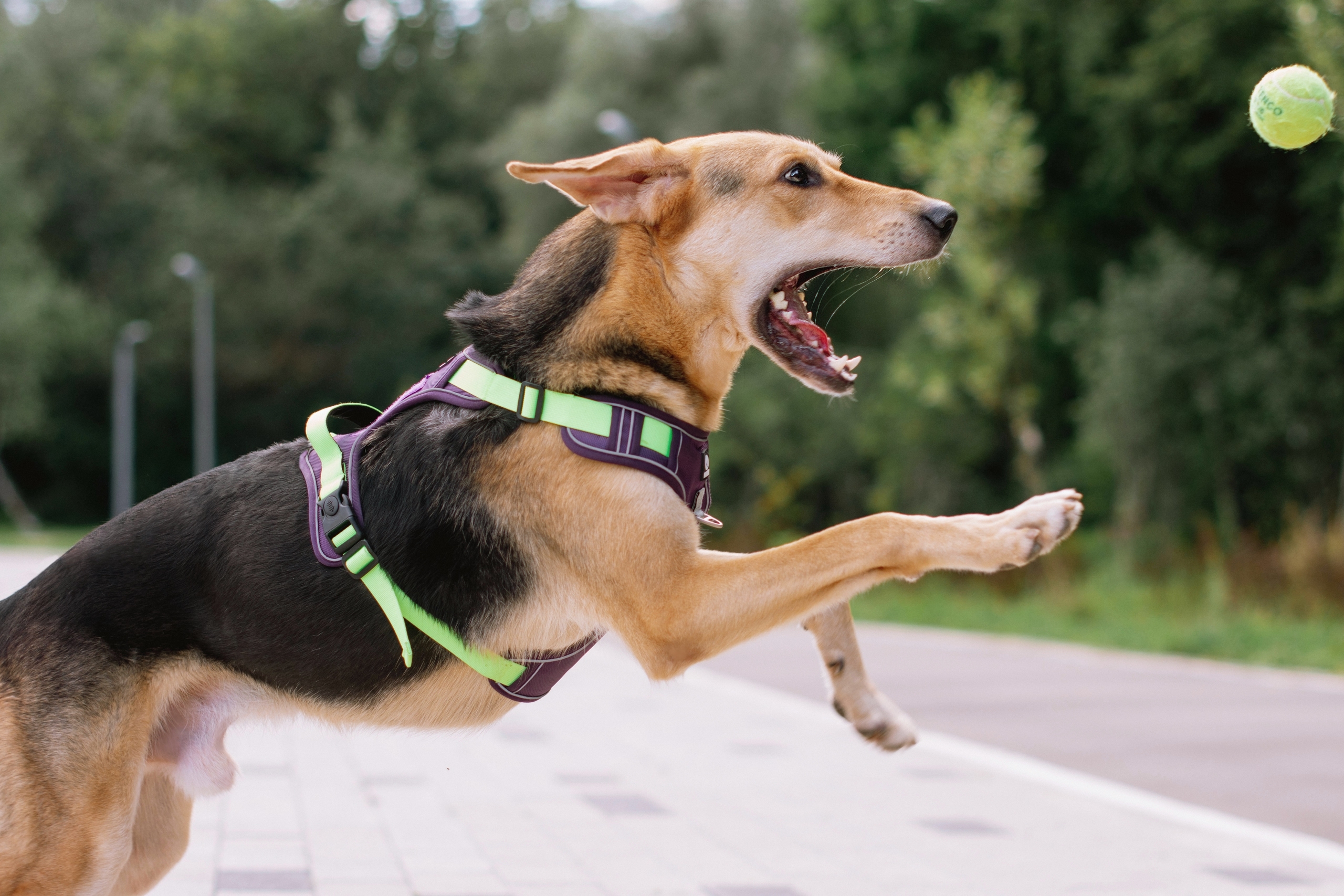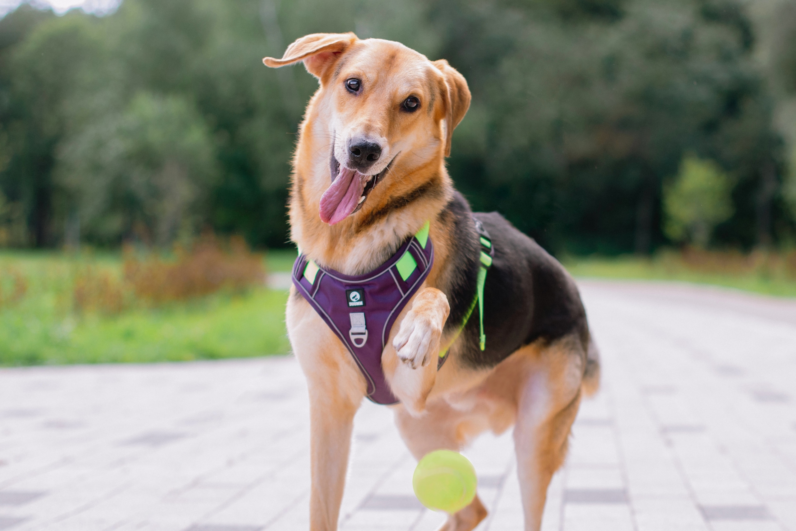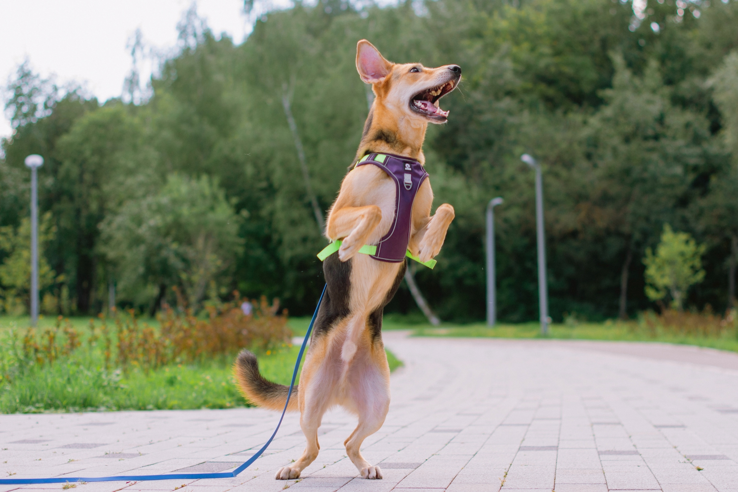 В силу возраста и характера – активный мальчик, любит тянуть поводок, лучше гуляет на шлейке или в недоуздке.