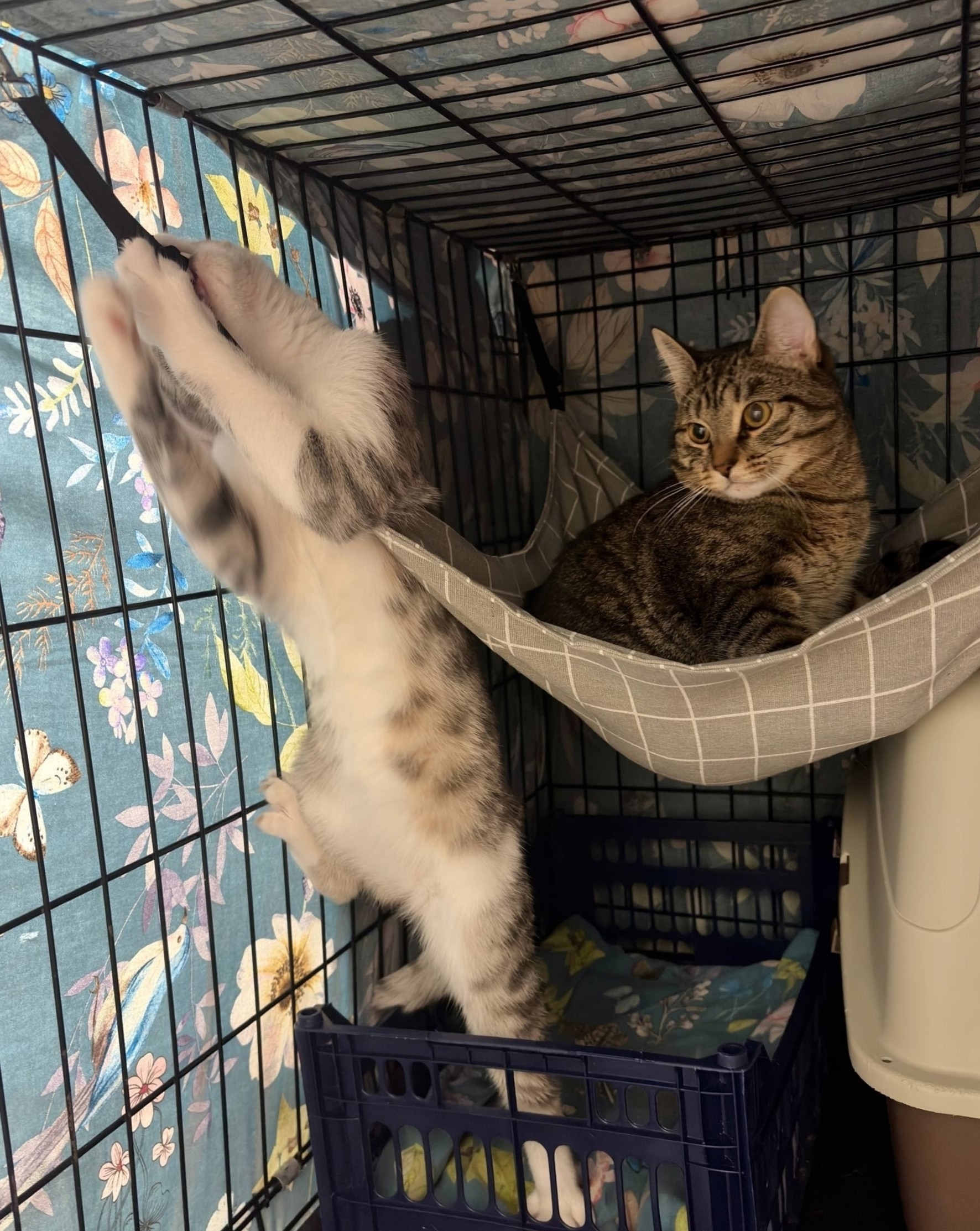 Гамак мальчишкам повесили только недавно… «Да начнутся голодные гамаковые игры!» – решили парни, и девчата над ними почувствовали, как земля содрогнулась 😂Если Чучу, Кусю и Рыжулю в гамачок по первости приходилось подсаживать, то эти ребята разобрались меньше, чем за минуту 😅 И Йонсик был быстрее: занял место и отражал поползновения товарища лапой и кусем 🙈 Поначалу Лео опешил и даже расстроился. Сел на когтеточку и призадумался. А думается лучше на полный желудок, поэтому парень перекусил, и решение пришло само: ежели гамак нельзя занять, эту незаконно установленную конструкцию надо демонтировать – мол, не доставайся же ты никому 😅😂